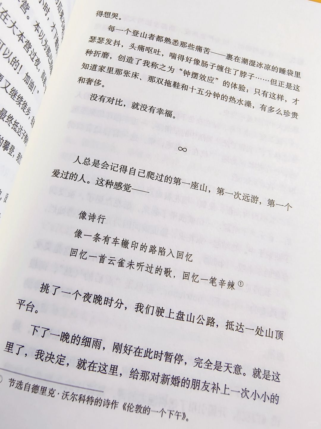 每一次的旅行都会做好计划,但是意外总是回发生。会有缺氧时的难受,吐到昏厥,但也要努力的攀爬到高峰。纵使是陡峭的山崖,爬过之后仍会害怕,稍有不慎就会掉落丧命。我想每一次的经历过后都将难以忘怀。就像书后面写的,看见天高地厚,看见一无所有,看见远方放羊的人们放羊,近处养花的人们养花,看见自在遥远,看见对无常的无所谓,在山外之山,在生活的另一些样本里,你不是所拥有的,你只是你。