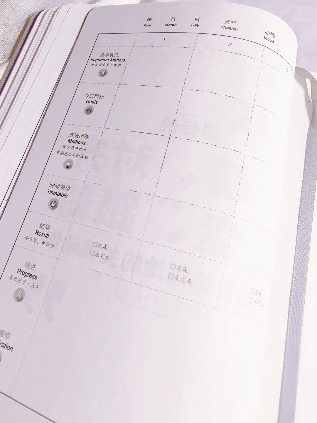 每日的To do list 已经给你划分出来,你只需要根据你自己需要做的事情,最重要的3件+今日目标+方法策略+时间安排+结果 这样把你的事情分的轻重缓急,你就可以有顺序的去做完你想要做的。