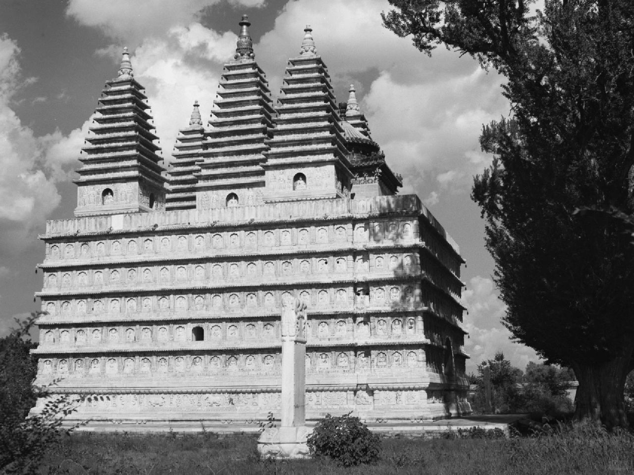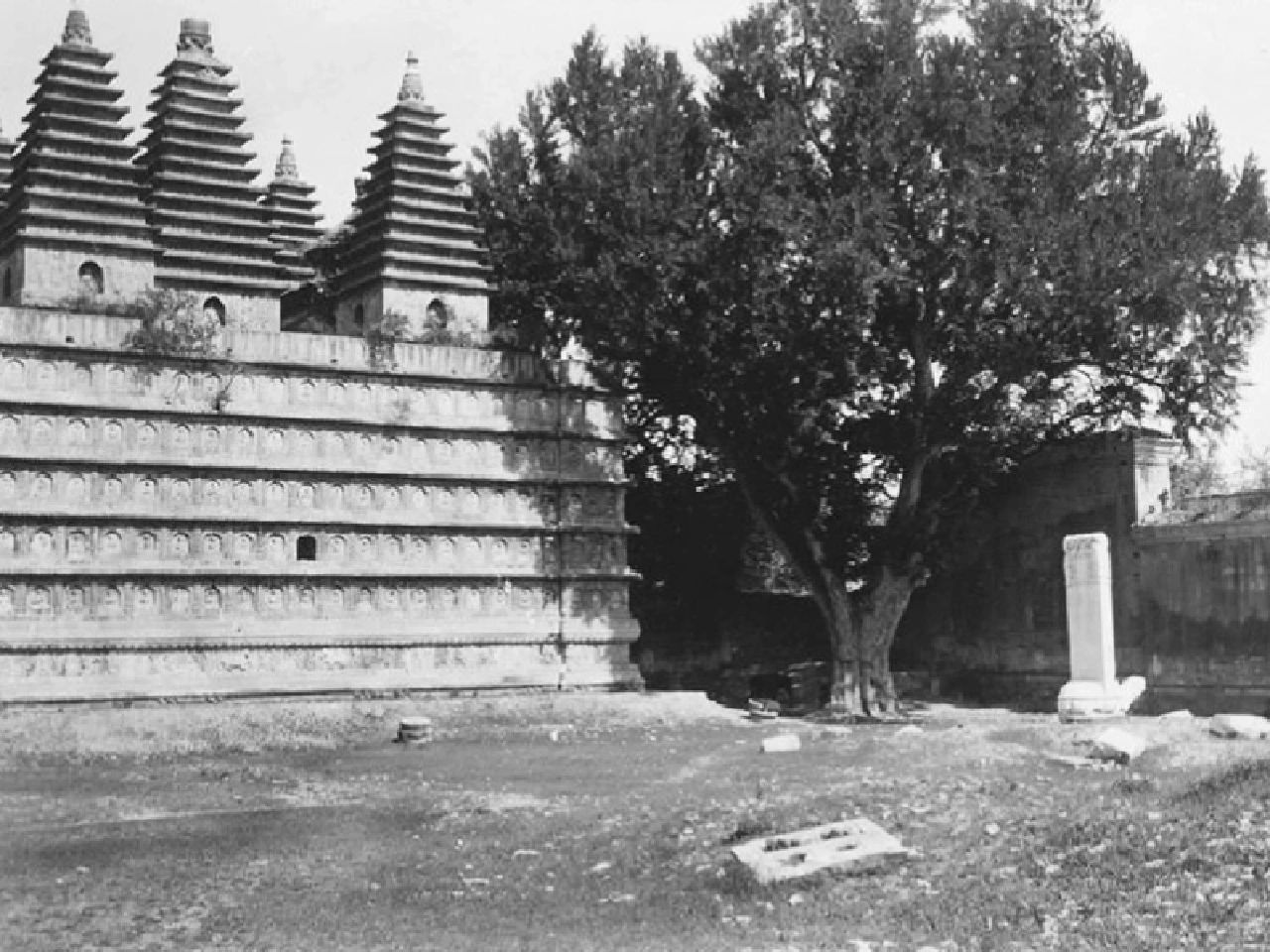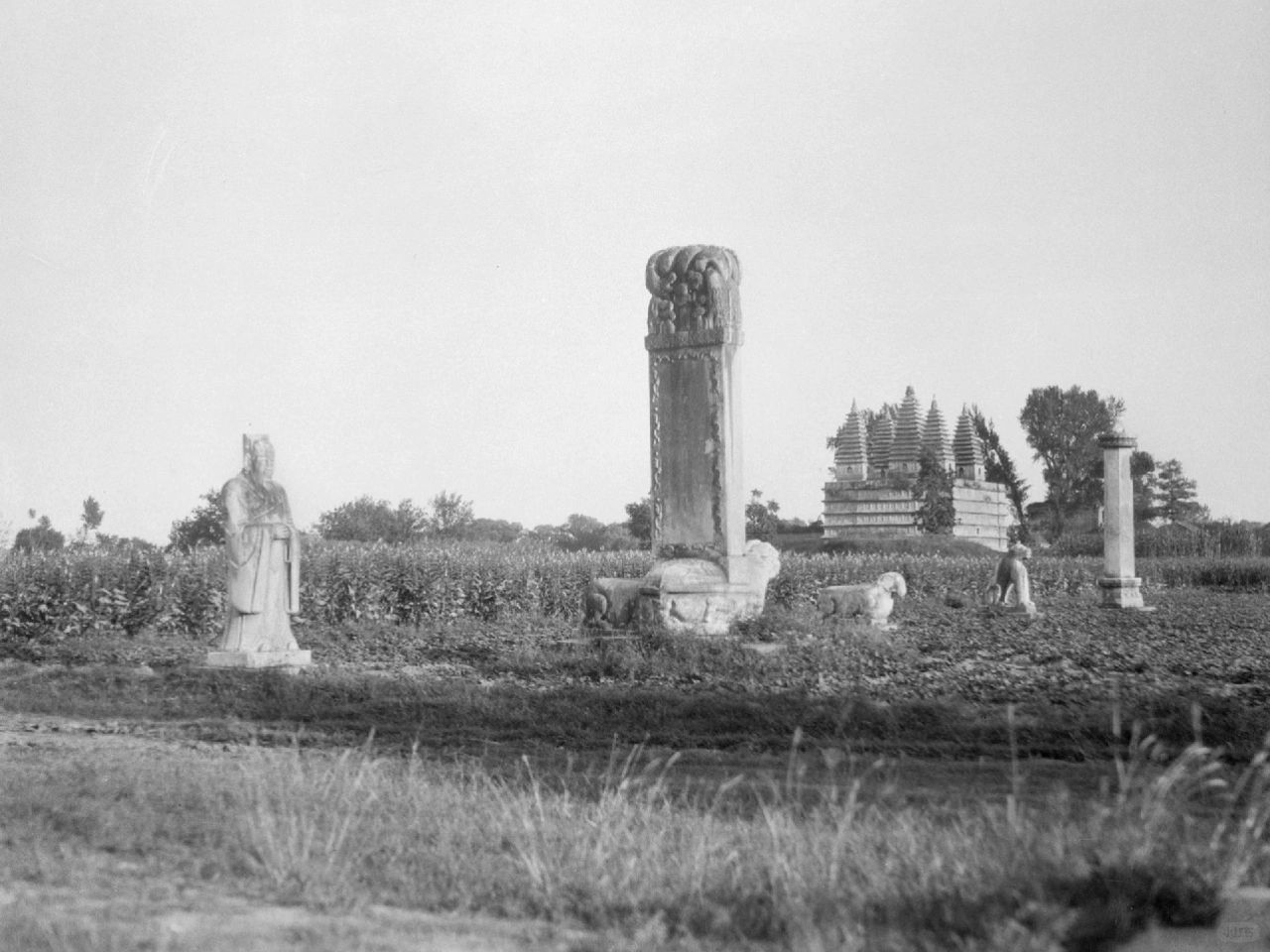图2、3,自北向南望五塔寺及周边石仲、石碑。