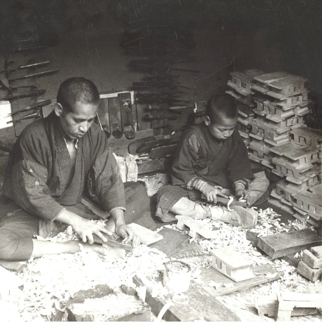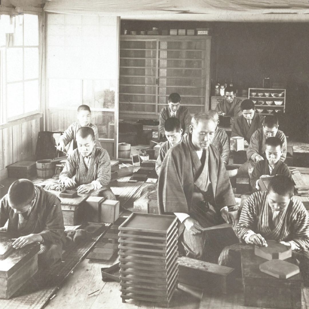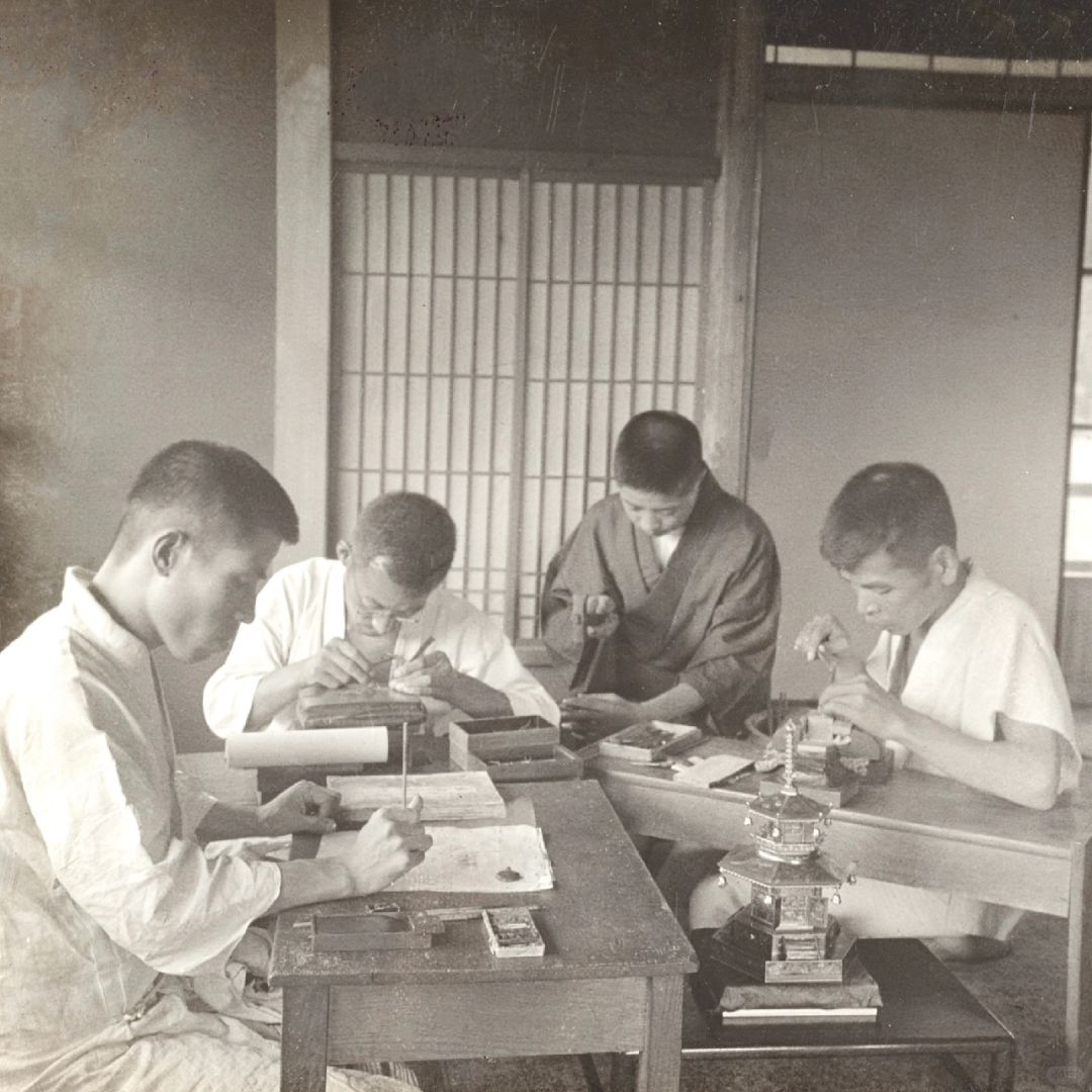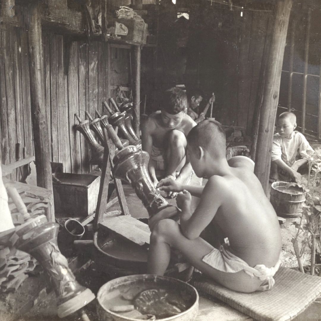 1993年,一所日本专门传授传统工艺技术的学校——“京都传统工艺大学校”诞生。80%的课程为实操且课桌即操作台,由一流的工艺师传授技艺,把世袭传家的传统手工艺与公共教育相结合,是京都传统工艺大学校的办学特色。专业涵盖了陶艺、木雕刻、佛像雕刻、木工艺、竹工艺、漆工艺、漆器莳绘工艺、金属工艺、和纸工艺、石雕刻、京手描友禅等专业。这组老照片源自于金士顿(Keystone View Company)公司创始人辛格利(B.L. Singley),拍摄于1900-1905年日本昭和及大正期间。