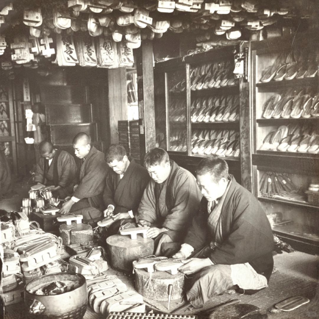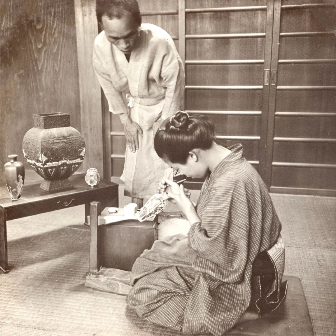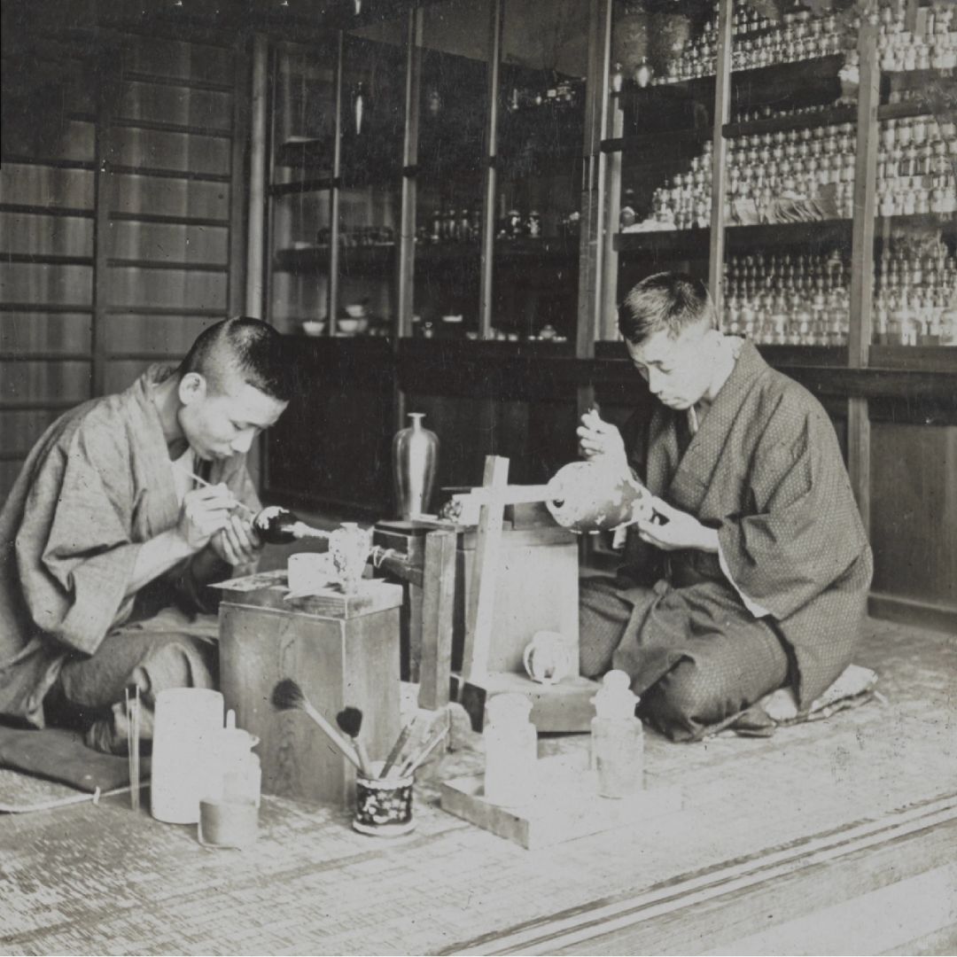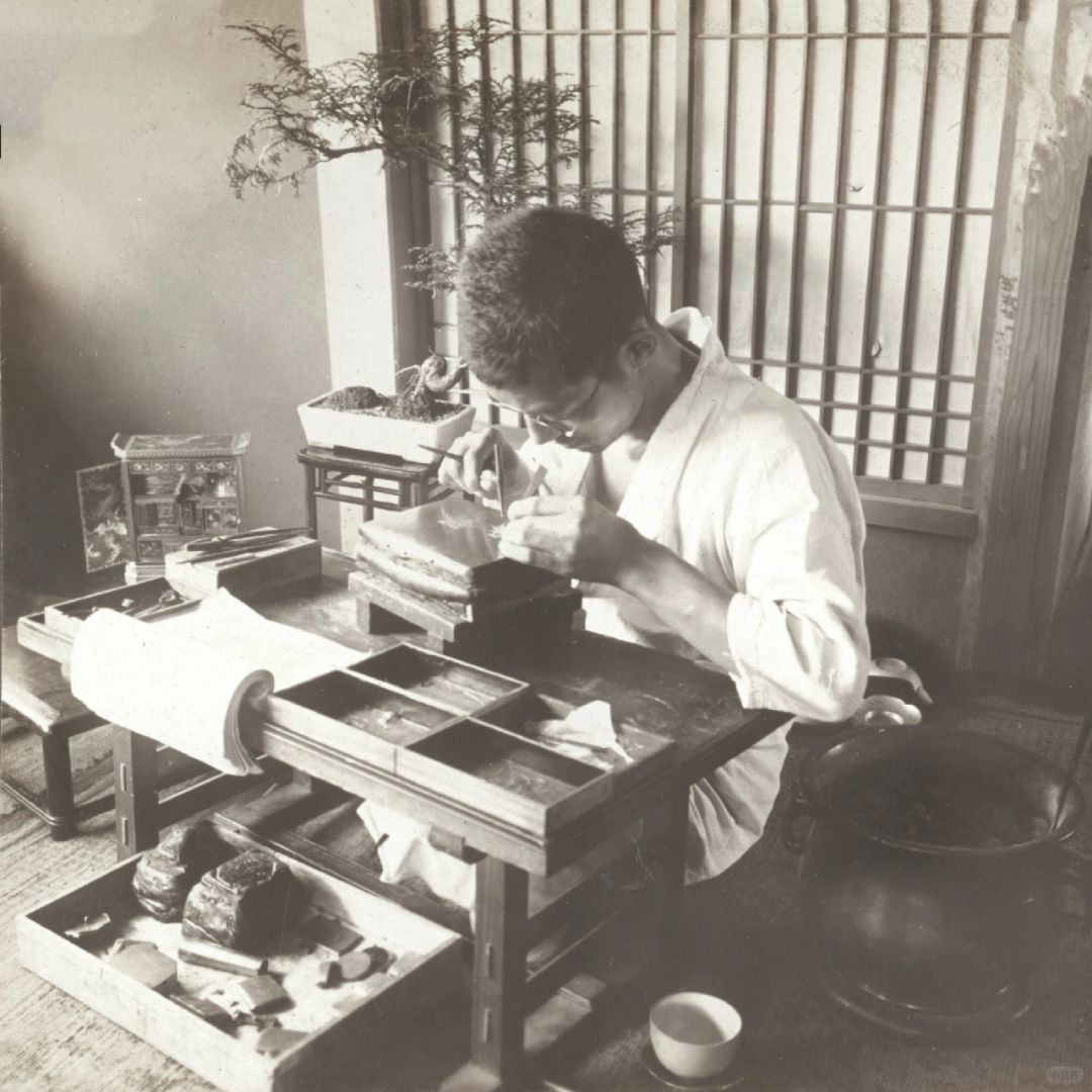 1993年,一所日本专门传授传统工艺技术的学校——“京都传统工艺大学校”诞生。80%的课程为实操且课桌即操作台,由一流的工艺师传授技艺,把世袭传家的传统手工艺与公共教育相结合,是京都传统工艺大学校的办学特色。专业涵盖了陶艺、木雕刻、佛像雕刻、木工艺、竹工艺、漆工艺、漆器莳绘工艺、金属工艺、和纸工艺、石雕刻、京手描友禅等专业。这组老照片源自于金士顿(Keystone View Company)公司创始人辛格利(B.L. Singley),拍摄于1900-1905年日本昭和及大正期间。