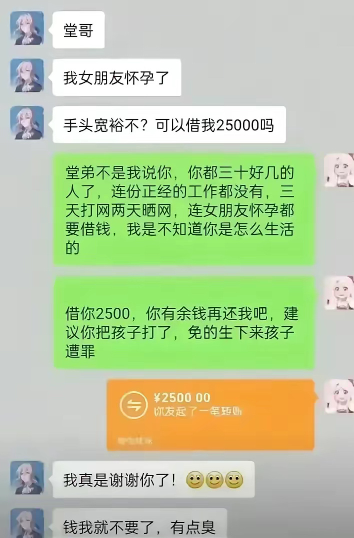 这人就不该有朋友。自己混啥样了不知道。不是兄弟关系可能2500都借不到