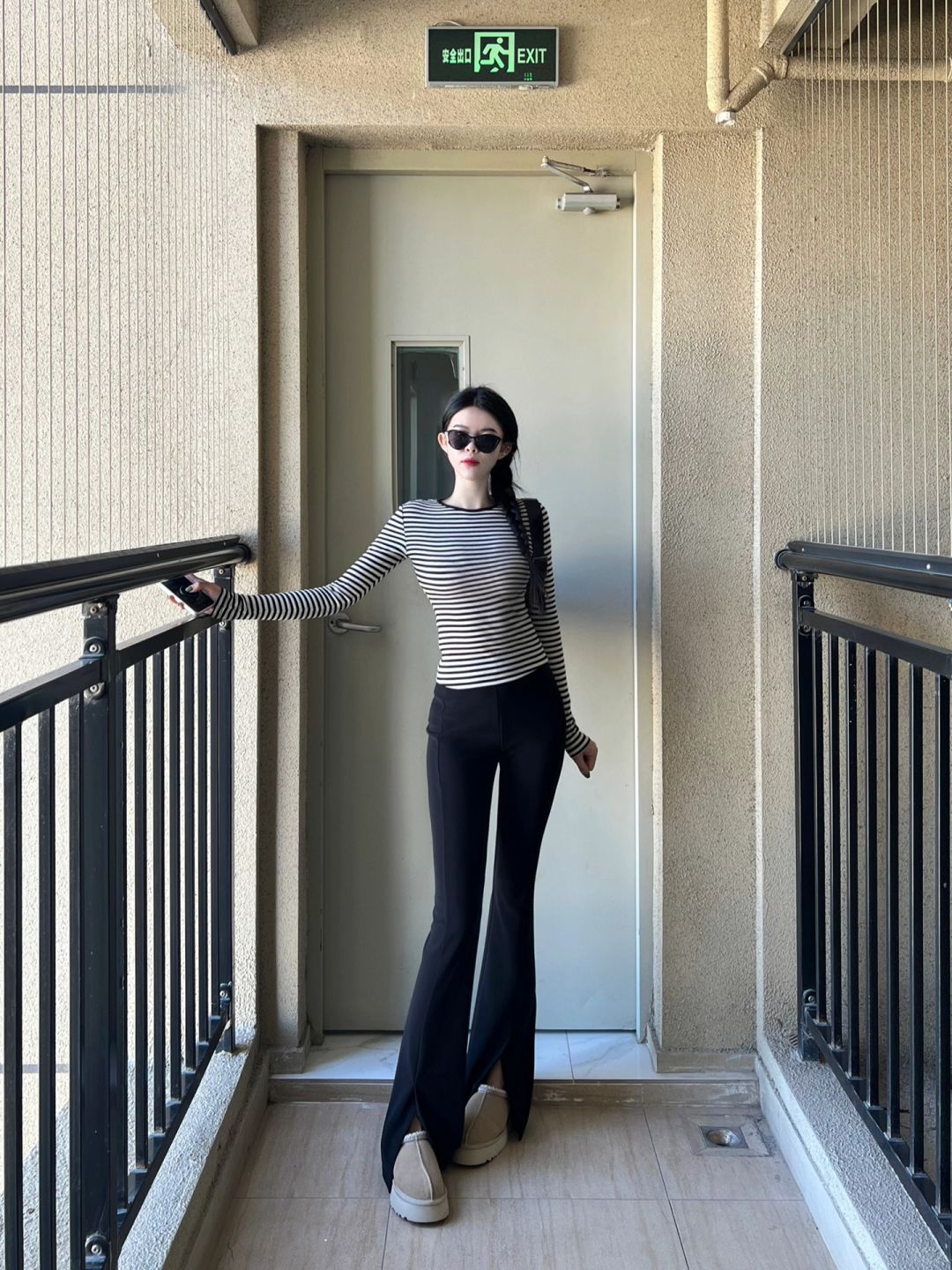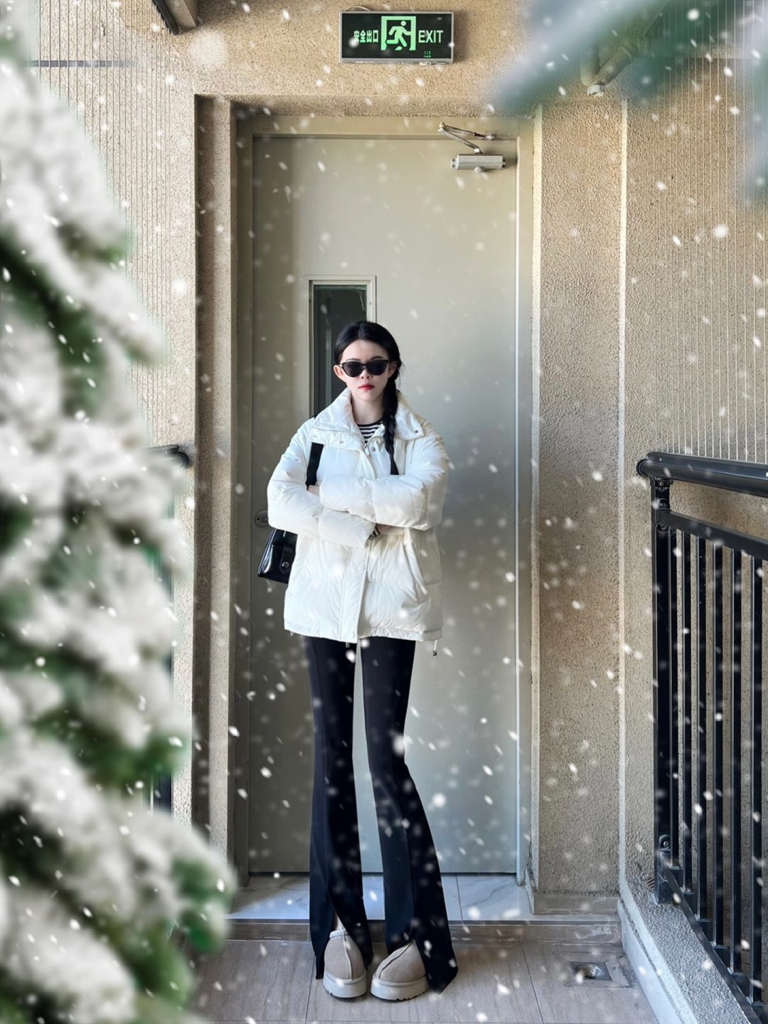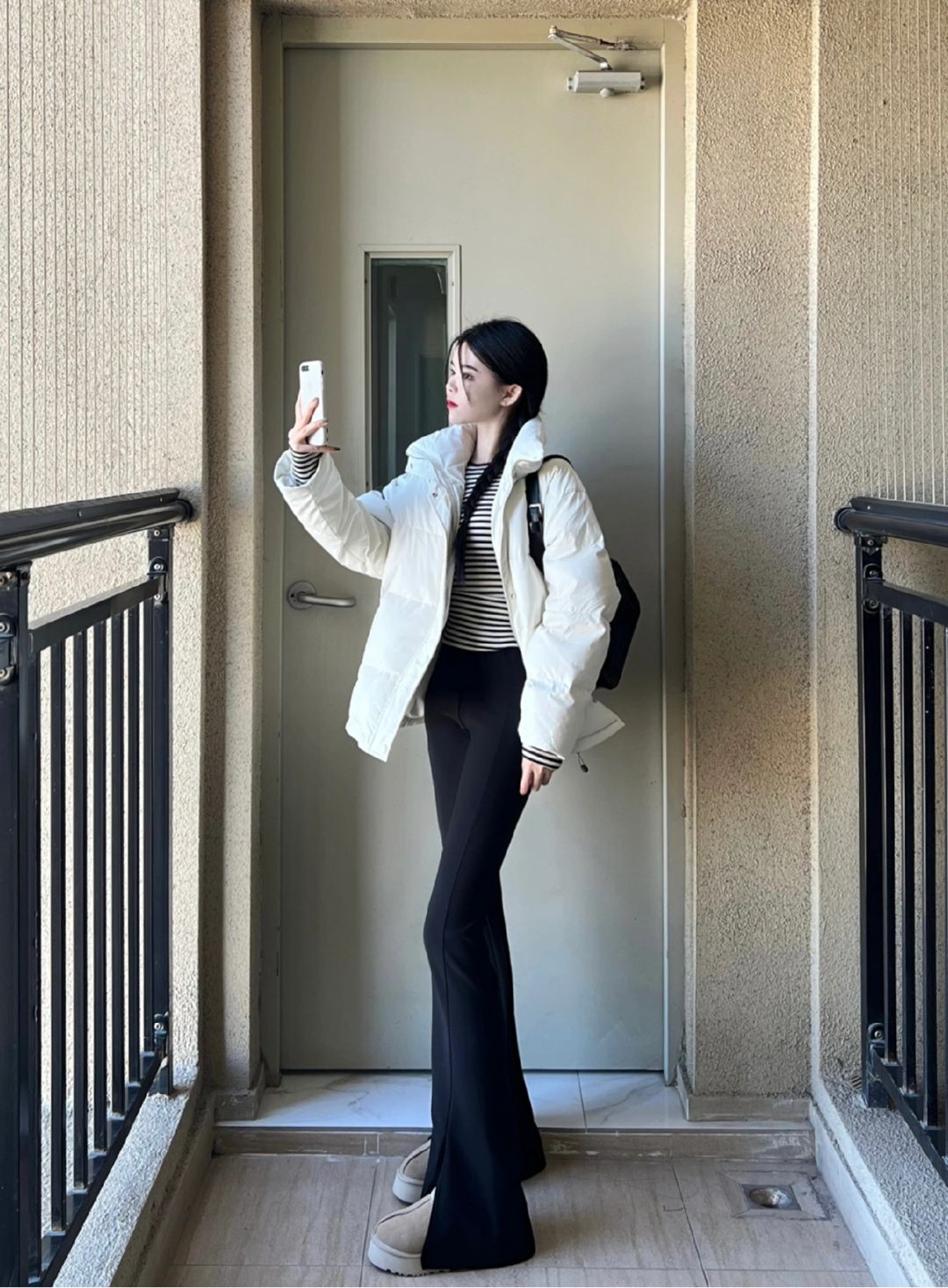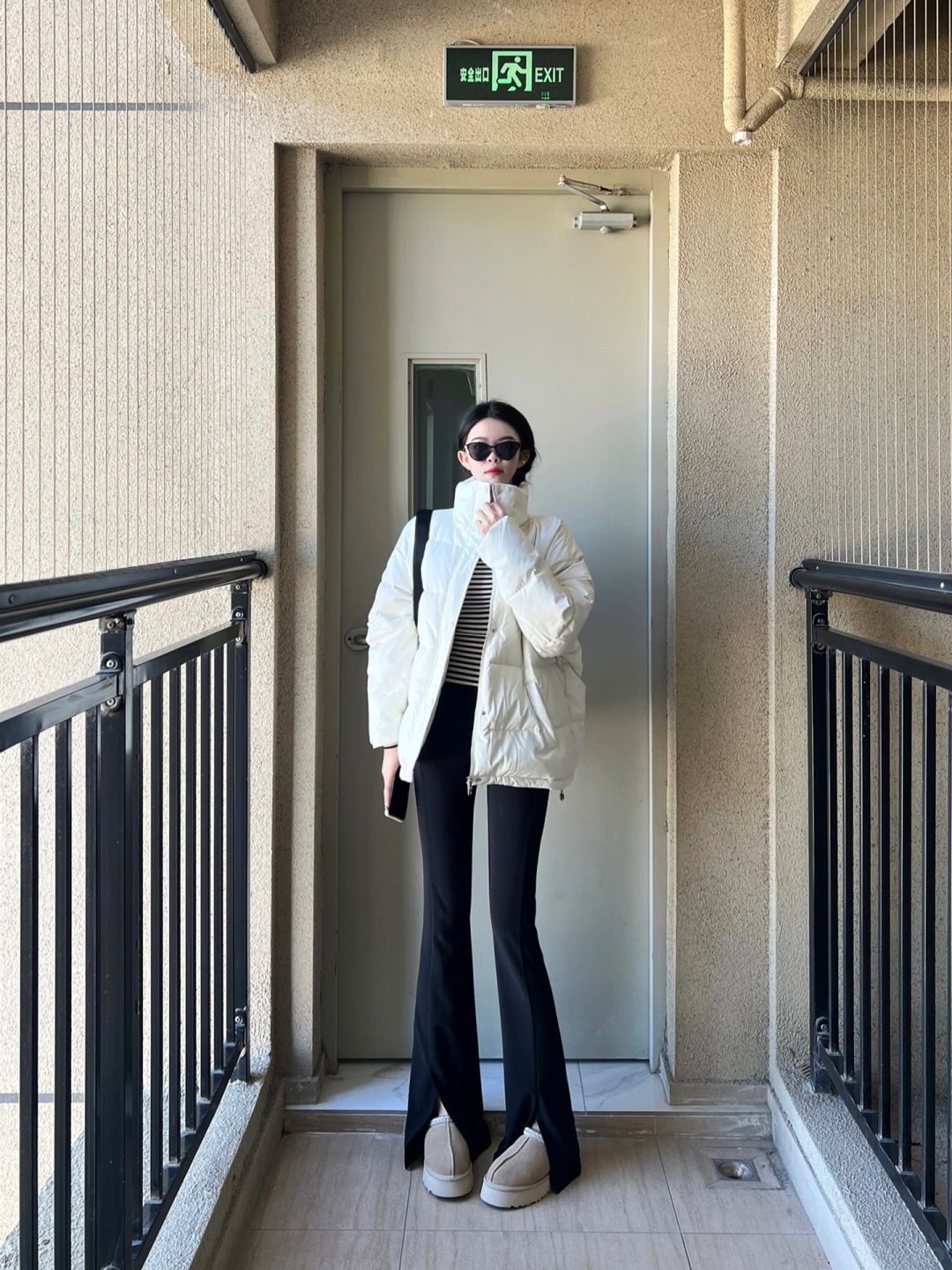 条纹上衣搭配开叉喇叭裤! 我的白色羽绒服它说喜欢极了!