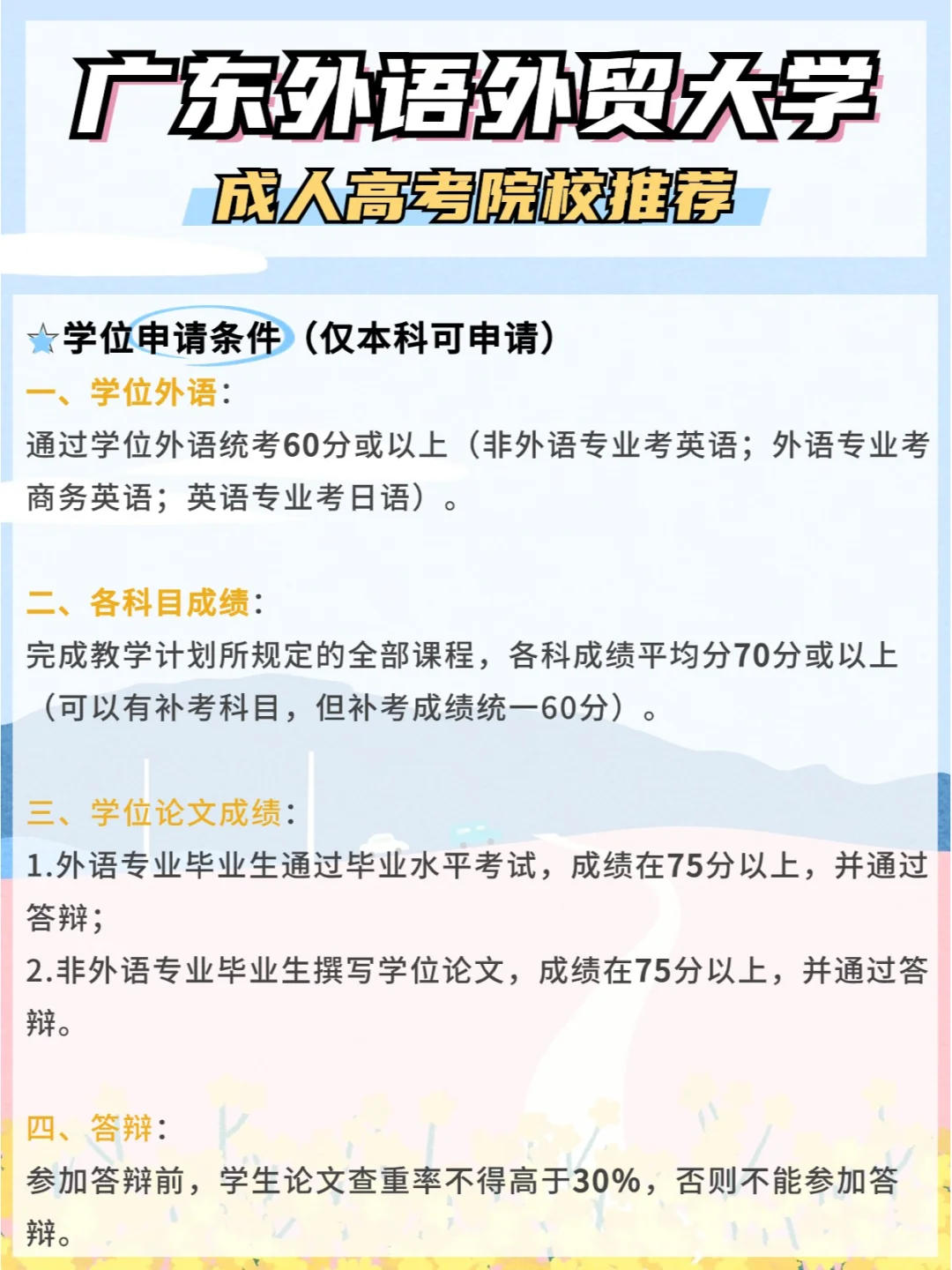 👀广东外语外贸大学在成考专升本、高起专和高起本中均有招生,并且可以报考大学英语四六级。 ☑️☑️招生层次: 高起专、高起本、专升本 ☑️☑️学制: 👉🏻高起专:3年 👉🏻专升本:3年 👉🏻高起本:5年 🔔成人高考每年10月份全国统一考试,在此之前需要选择好专业,学习备考。 ⚠️成人高考报名有户籍限制,一般异地报考需要有居住证或社保,具体要求每个地区都不同,所以想在异地报报名成考的,可以先看下自己是否符合条件,不符合尽早去补,以免耽误报名。