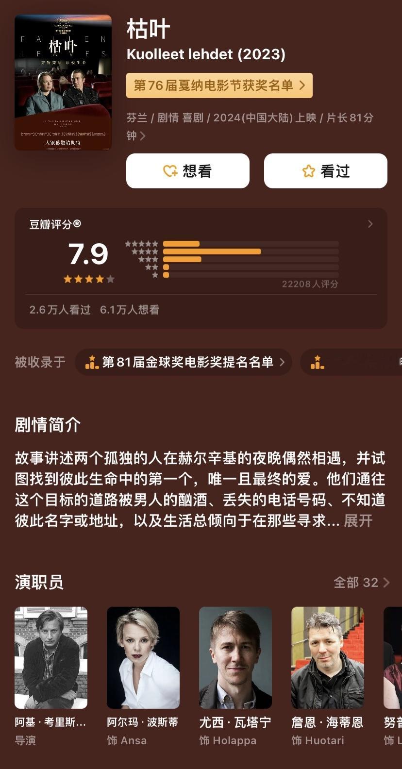 #电影枯叶确认引进# 芬兰大师阿基·考里斯马基编剧并执导的《枯叶》已确定引进,档期待定!!!