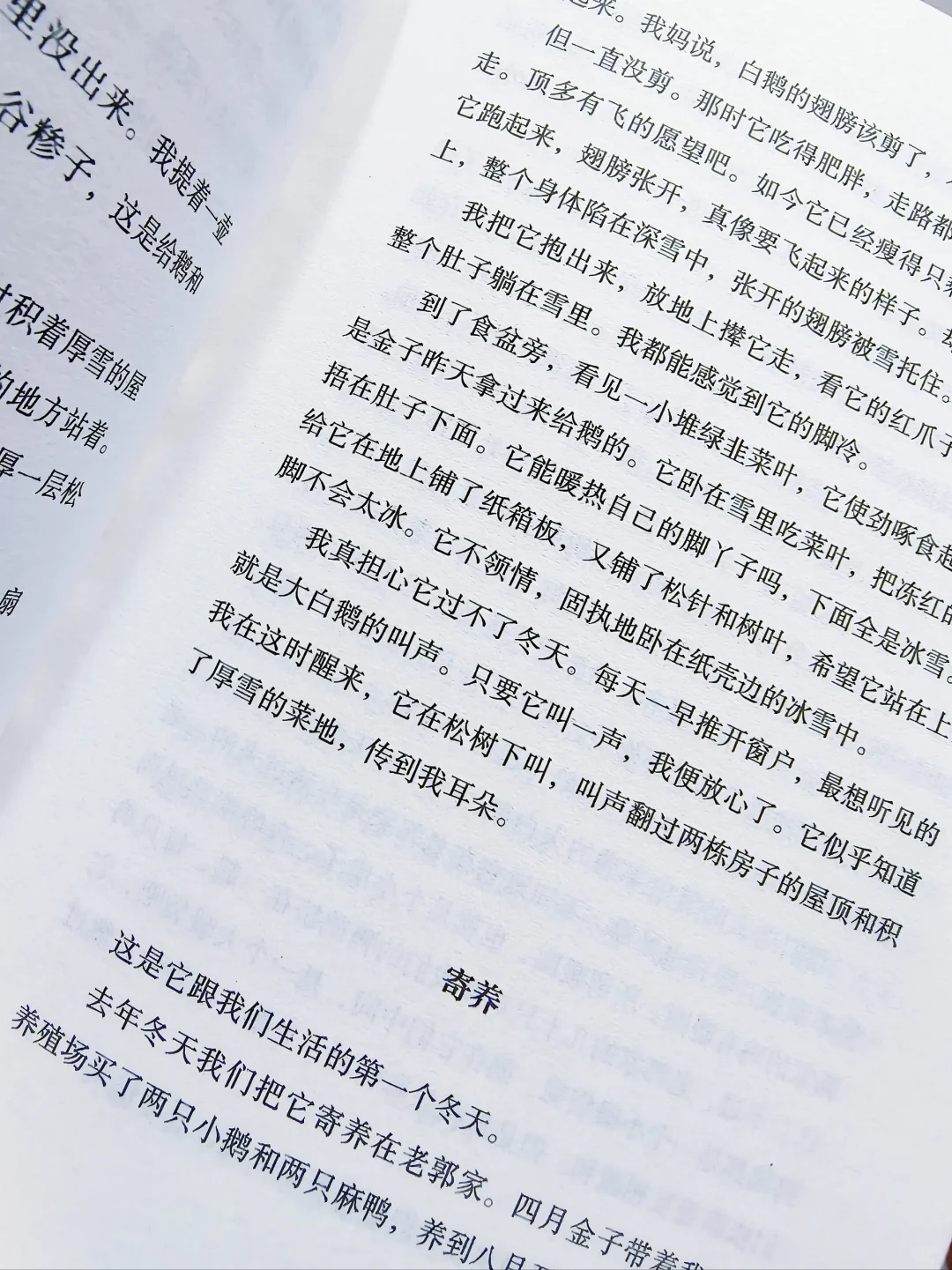这本书中就好像是日记在记录着作者身上发生的每一件事。在家乡养的猫,鹅,狗很多很多的动物。书中的大白,生了一窝又一窝的小猫。他们会将自己的孩子送给别人。在家乡的猫是会捉老鼠的,每个动物都拥有属于他自己的任务。就像那年发洪水一样,水火无情,关乎到每一个人的生命安全。但最终也没能逃过,干警们的光荣牺牲。