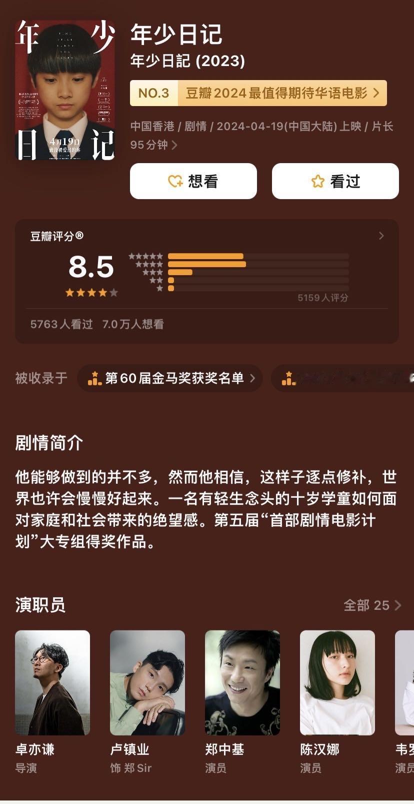 -《年少日记》聚焦原生家庭之殇,卢镇业、郑中基、陈汉娜等主演,故事从一本少年日记切入,将中学教师郑Sir充满暴力的童年往事与遗憾丛生的成年时光连接起来。