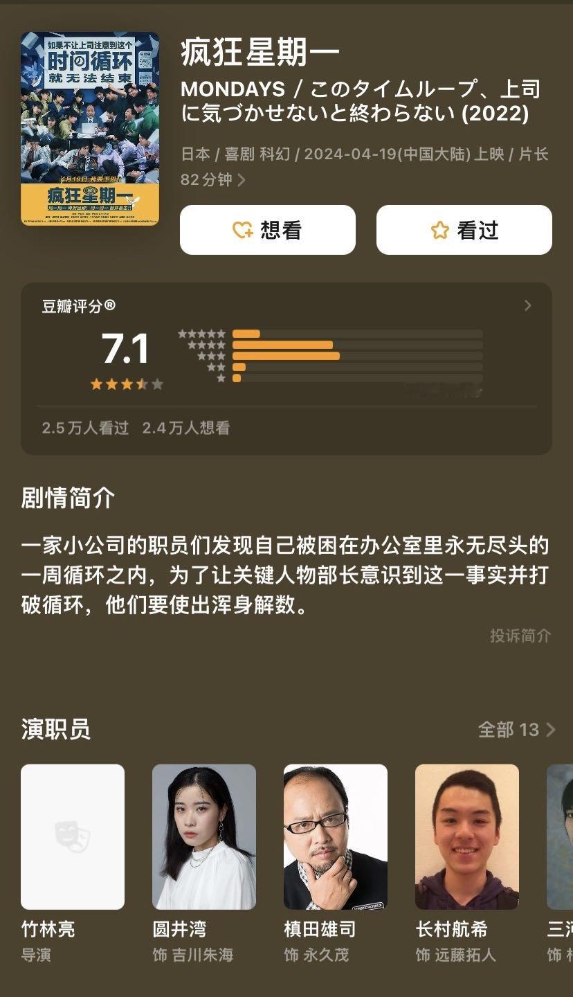-《疯狂星期一》中二搞笑的社畜电影。讲述一家广告公司的职员们发现自己被困在办公室里永无尽头的一周循环之内,只有让关键人物部长意识到这一事实才能打破循环。