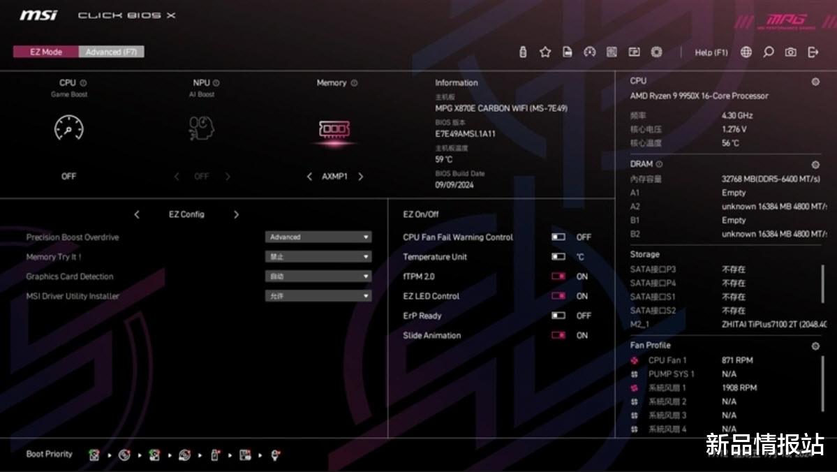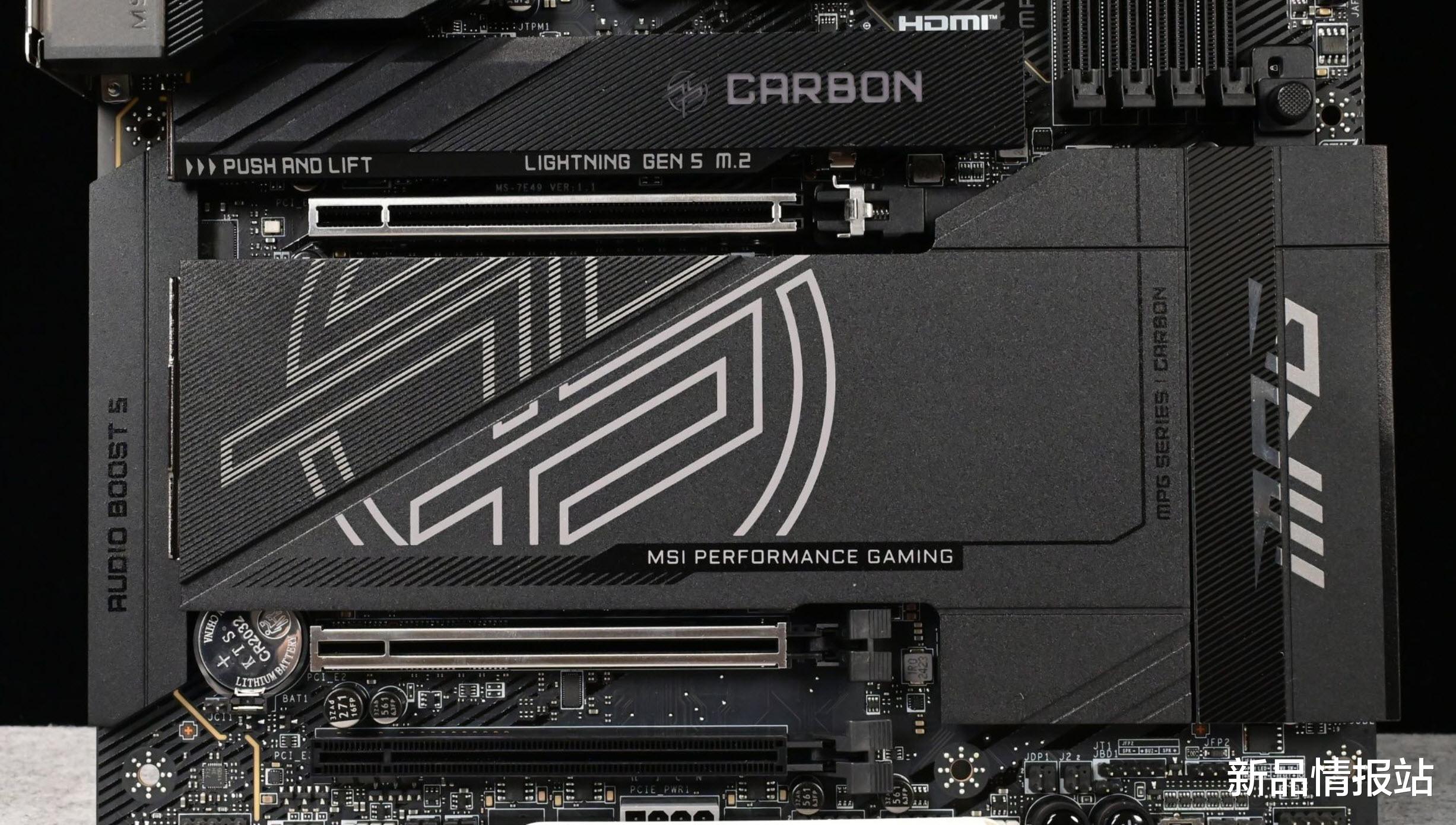 微星MPG Z870E CARBON WIFI采用了AMD X870E芯片组,这一芯片组为主板提供了出色的性能基础。它配备了两颗Prom21南桥芯片,使得CPU提供的PCIe×16插槽与M.2接口均支持PCIe5.0速率,并且能够提供12条PCIe4.0通道和8条PCIe3.0通道,如此强大的通道配置为多设备连接和高速数据传输提供了有力保障。该主板支持AMD锐龙9000/8000/7000系列台式处理器,AM5接口的使用不仅让其能够适配现有的锐龙7000系处理器,还能保证在未来几年内的兼容性,AMD承诺AM5接口至少沿用至2027年,玩家无需担心主板会很快被淘汰。