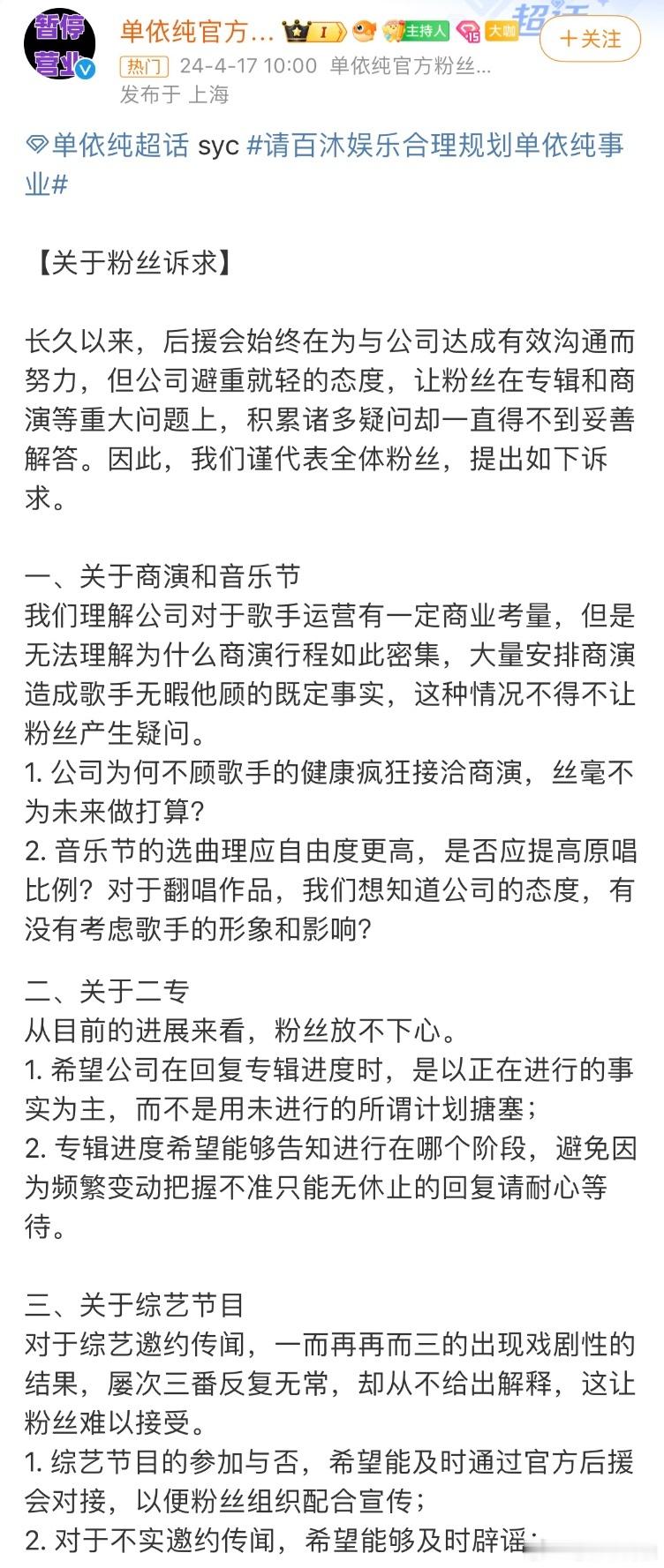 #单依纯官方后援会暂停营业#看到单依纯这个行程表,难怪粉丝会不满了,好好的实力歌手却天天跑商演,歌手也不给去上……