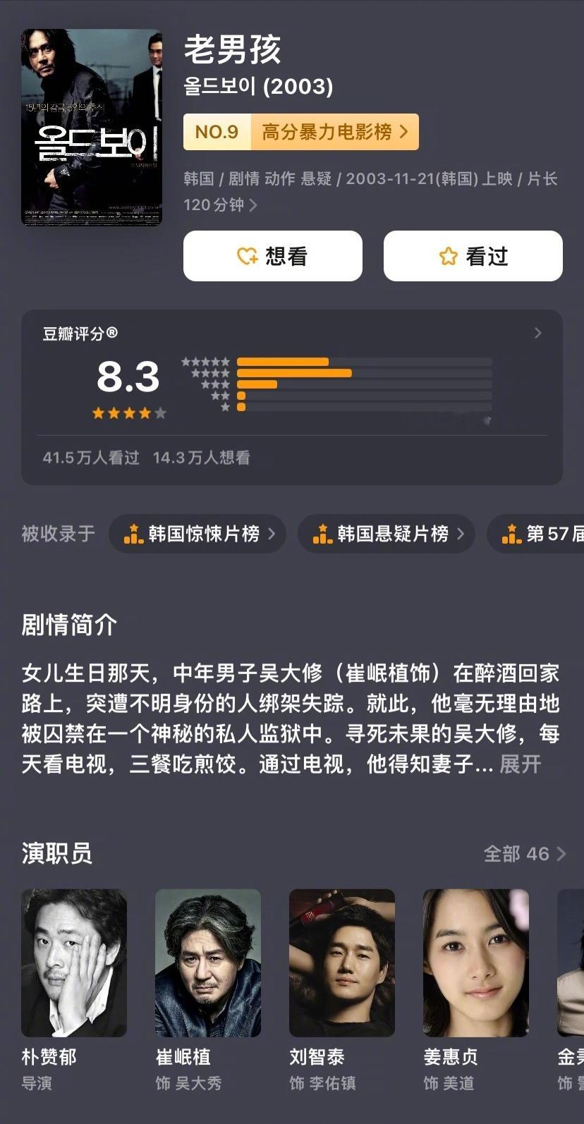 #老男孩英文剧集版# 经典复仇惊悚片《老男孩》将拍英语剧集!该片导演朴赞郁与狮门合作打造,将担任制作人。