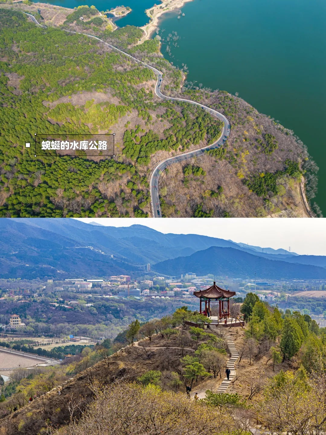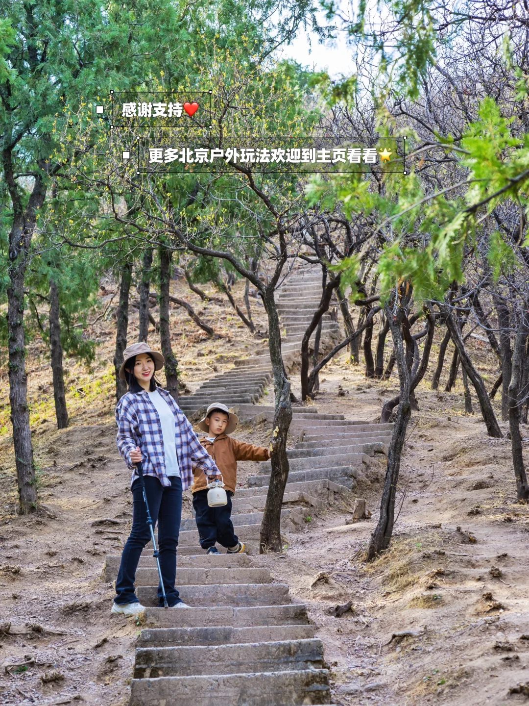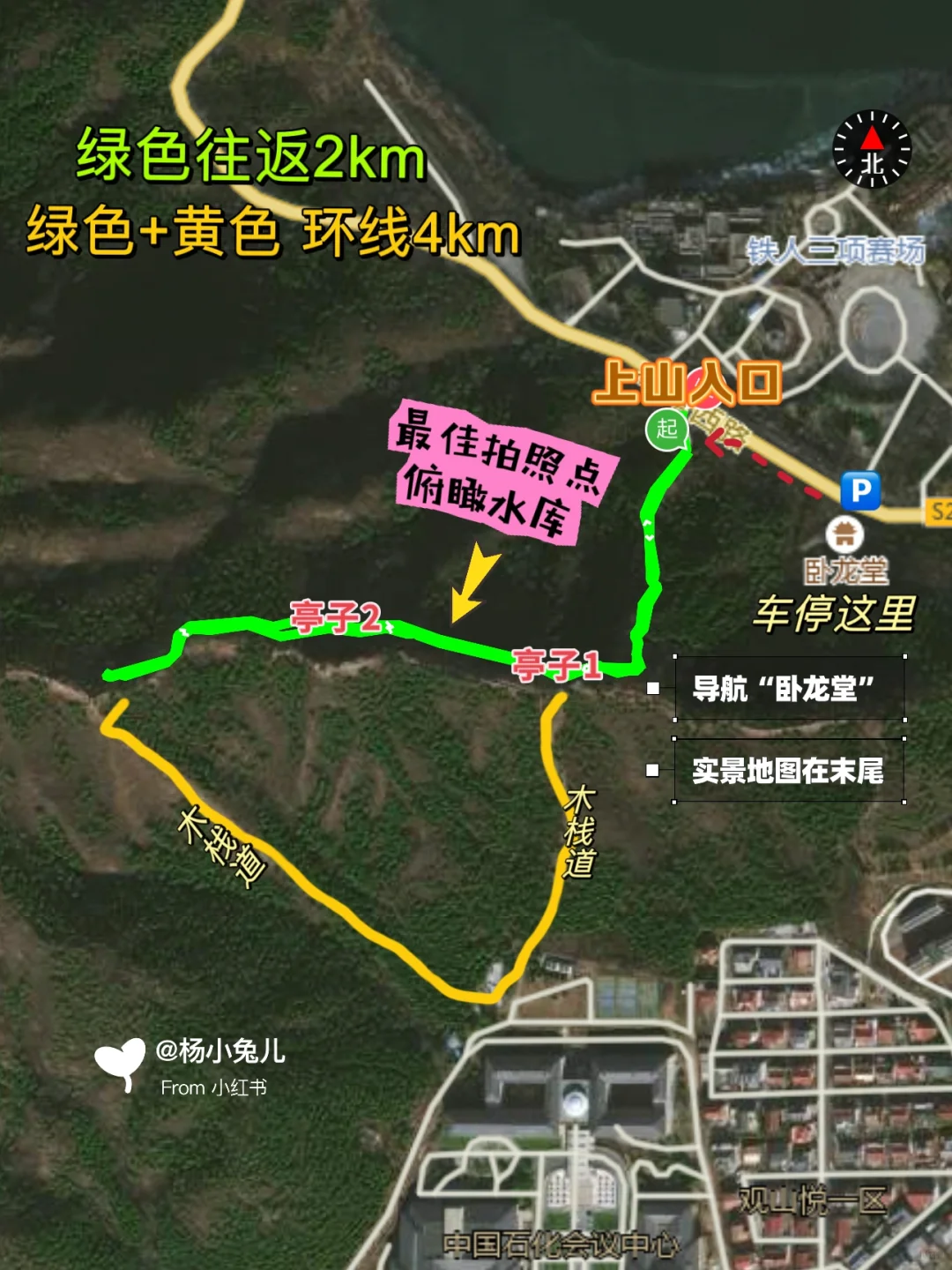 ʜ̆̈ᴇ̆̈ʟ̆̈ʟ̆̈ᴏ̆̈大家好🎀 这里是爱户外、爱遛娃的杨小兔儿🐰 . 春季户外正当时🌿如果你想去户外看看山河美景,但又不想费太多体力,可以走走这条适合低幼全家出行的徒步路线‼️走在山脊上,俯瞰十三陵水库,距离近,还免费~快来看看吧‼️ . 🌟推荐理由🌟 ✔️开车40分钟即达,公交也可直达 ✔️俯瞰十三陵水库、九龙游乐园和远山 ✔️两条线路难度适合不同人群 ✔️20分钟快速登顶,不费体力适合全家 . 🌈昌平十三陵水库登山步道 🧭自驾导航卧龙堂,对面即是停车场,停好车前行(向西)20米,即可看到登山入口 🚌公交车在“朝凤庵站”下车 ‼️注意‼️不要再导航中石化会议中心了,那里把门封住了,影响人家办公现在不让上了 🗺️老规矩,路线图和实景地图都给大家画好了,直接抄作业 . 2️⃣条徒步路线攻略 🟡短线:往返1.8km,用时1h 👉🏻从小门往上走是台阶路,10分钟到达第①个小平台,可以俯瞰九龙游乐园和水库 👉🏻穿过一片松林,走5分钟可到达第①个小亭子 👉🏻从小亭子出来右转走土路,5分钟可以到达第②个亭子,这是整个徒步路线的蕞高点,然后徒步返回 . 🔴长线:往返4km,用时2h 👉🏻到达第②个亭子后一直往前走,可以绕一圈,是一条小环线,整条路线中有两条木栈道比较好走,其他都是碎石路,不过难度很低,低幼可完成 . ☑️附近景点 这里可以和十三陵水库一起一日游,附近洋台子村、东园村和六道河都可以玩儿水露营 . ⚠️温馨提示⚠️ ▪️有的台阶可能有点高,但雪球5岁可以完成没有难度,3三岁以下可能不太适合 ▪️全程无补给,需要自备饮料和食物 ▪️有垃圾桶,但山上全程没有卫生间 . 我是杨小兔儿🐰 四代土生土长的北京大妞儿😝 爱旅行、爱分享、擅长做实用攻略✏ 更多宝藏旅行好去处🌲欢迎去主页看看🏷 -