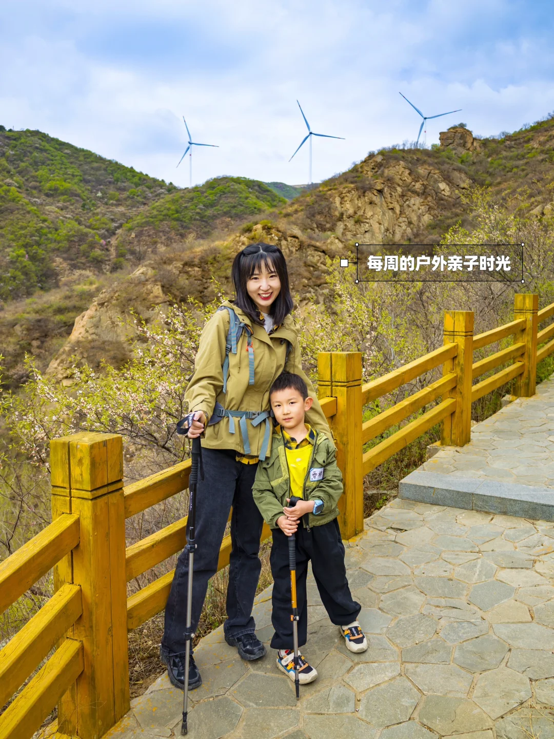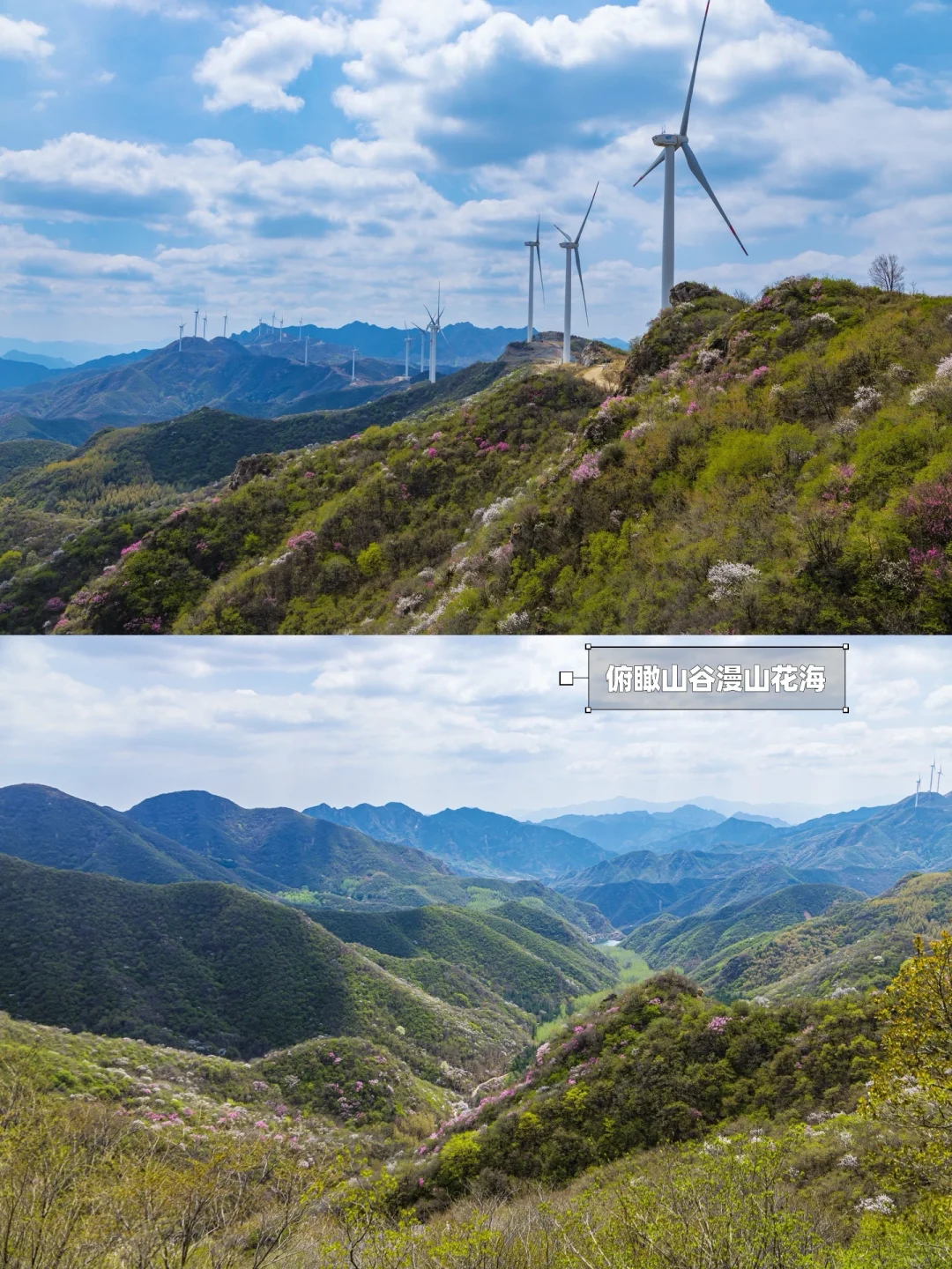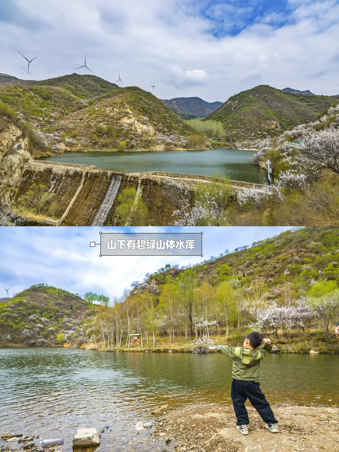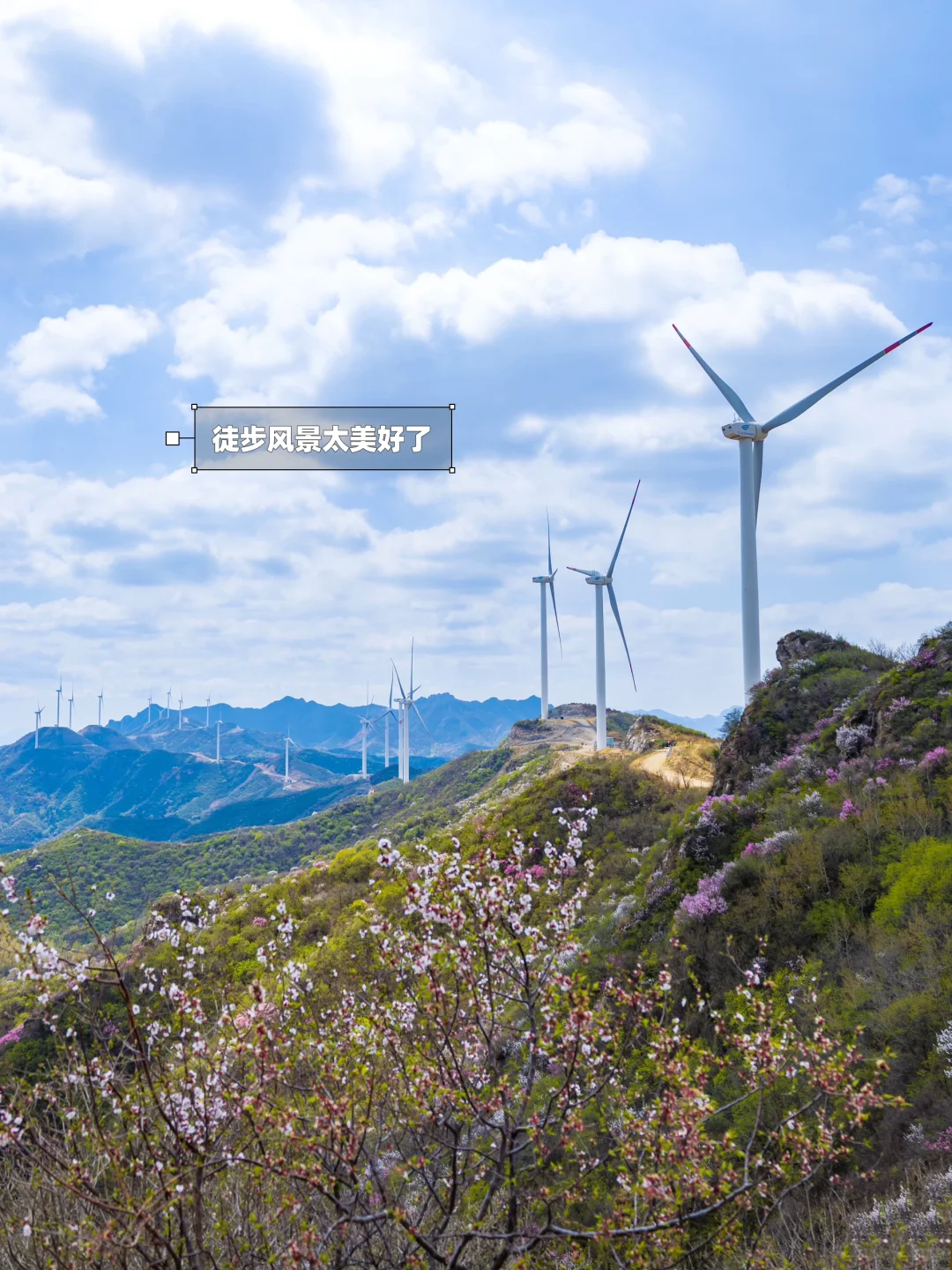 2️⃣到山体水库后,延岔路左侧上山,再走2.8km途径水源头,蕞终达到山顶,可以看到巨大发电风车和北京-河北界碑。一路上有凉亭、小溪,看山桃花
