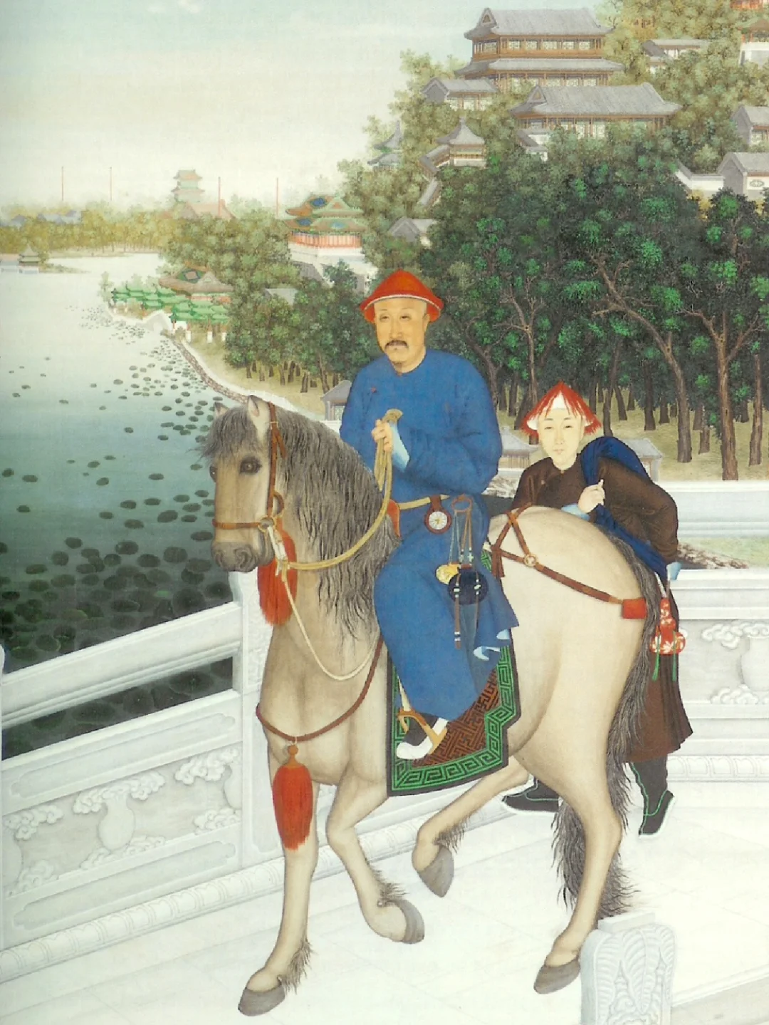 图17、清人画乾隆西苑御马像(局部)。乾隆皇帝在金鳌玉棟桥上骑马,背景后为北海琼岛。
