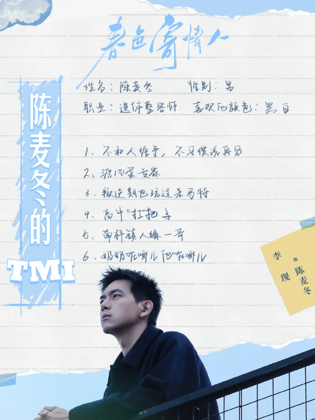 陈麦冬,《春色寄情人》南坪镇镇草,人“冷”话不多、职业缘故不爱笑,时时刻刻保持着“识趣退出热闹波段”的距离感。
