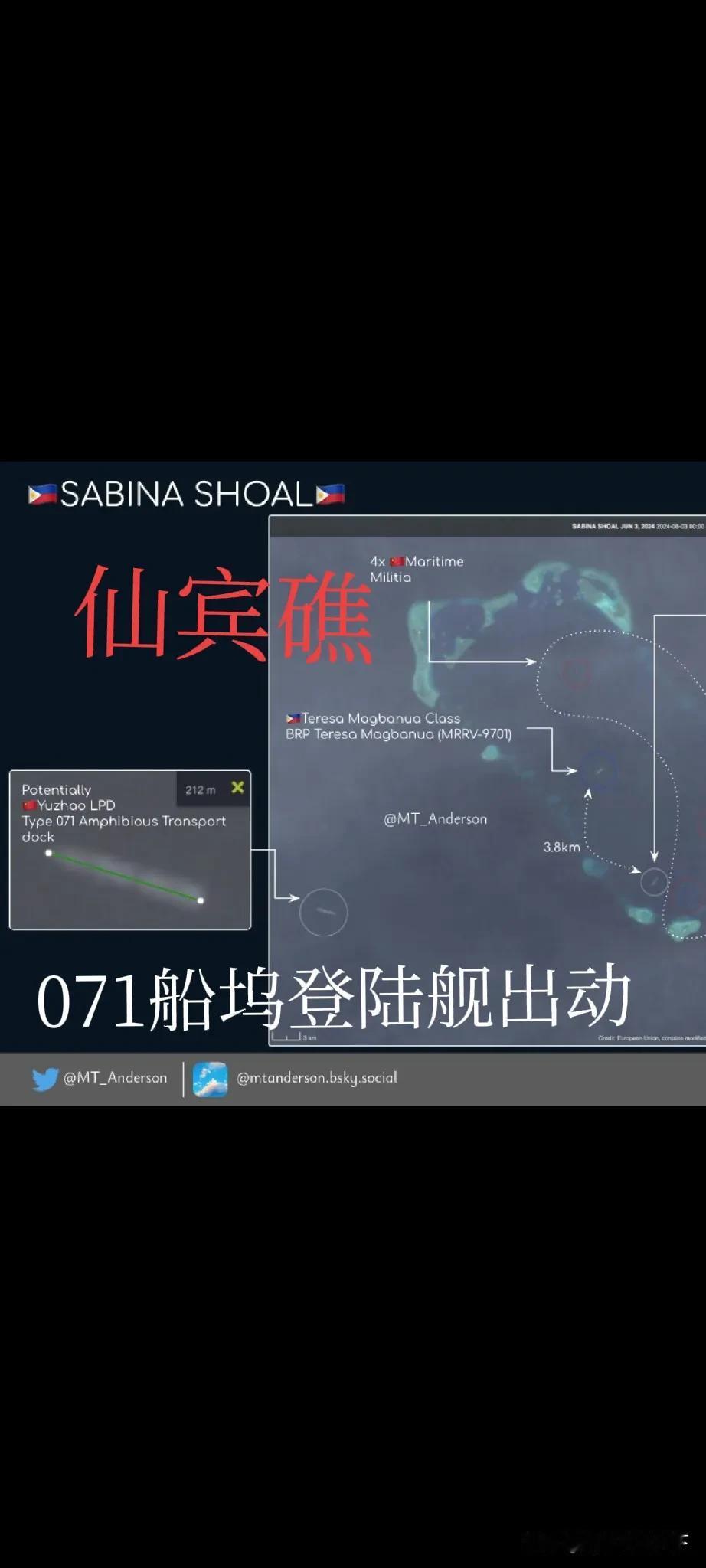 仙宾礁形势又出现新变化!中国海军071型船坞登陆舰昨天开始现身仙宾礁西南50公里处驻泊待命!仙宾礁礁盘内中国船只增至8艘! 根据北京时间今天早晨8点39分获取的仙宾礁海域船舶态势图(图1),我们可以看到,在今天早晨的仙宾礁,中国和菲律宾船只形成了8对1的对峙态势。中方船只为海警3303舰加7艘大型渔船。菲方船只为日本援助97米级“马格巴奴亚”号大型巡逻舰(编号9701),这已经是他赖在仙宾礁内部的第48天! 在图一上,我们还可以发现,中国船只在北东南三个方向对菲律宾船只实施了包夹,防止其登礁,而只在西南方向为其留出了一个缺口。如果菲律宾船只愿意离开仙宾礁礁盘的话,可以随时从西南方的这个豁口自己自行离开! 与此同时,中方也做好了两手准备,就在昨天开始,卫星图显示在仙宾礁西南方外围约50海里处,出现了一艘中国071型大型两栖登陆舰的身影(图2)。 注意,这是一艘两栖登陆舰,这就意味着在他巨大的船体内部,可能装载了两栖战斗车辆,也可能装载了大量的人员,这一点,恐怕就连菲律宾方面都摸不着头脑!这正是我们想要达到的效果,可以让菲律宾方面有所忌惮,不要乱说乱动!如果菲律宾这艘海警船在仙宾礁内部想搞什么小动作的话,我们的现场执法力量,在一个多小时之内就可以赶到,对其进行驱离和拆除!! 同时从下图5中南海群岛的位置图上我们研判,这艘071型大型两栖动物舰应该是来自于附近的美济岛。众所周知,经过2016年的填海作业以后,目前美济岛的规模在南海已经屈指可数,不仅可以停靠大型运输机和战斗机,还可以在内部泻湖中停靠包括071舰在内的大型船只! 而这正是我们在南海领域开展维权的底气所在!对于菲律宾方面来说,他们之所以派出这艘9701号海巡舰在此地停留48天,一定是别有企图而绝对不仅仅是其声称的只是在仙宾礁内掩护科考队员开展工作。 对此,相信我们已有预案!