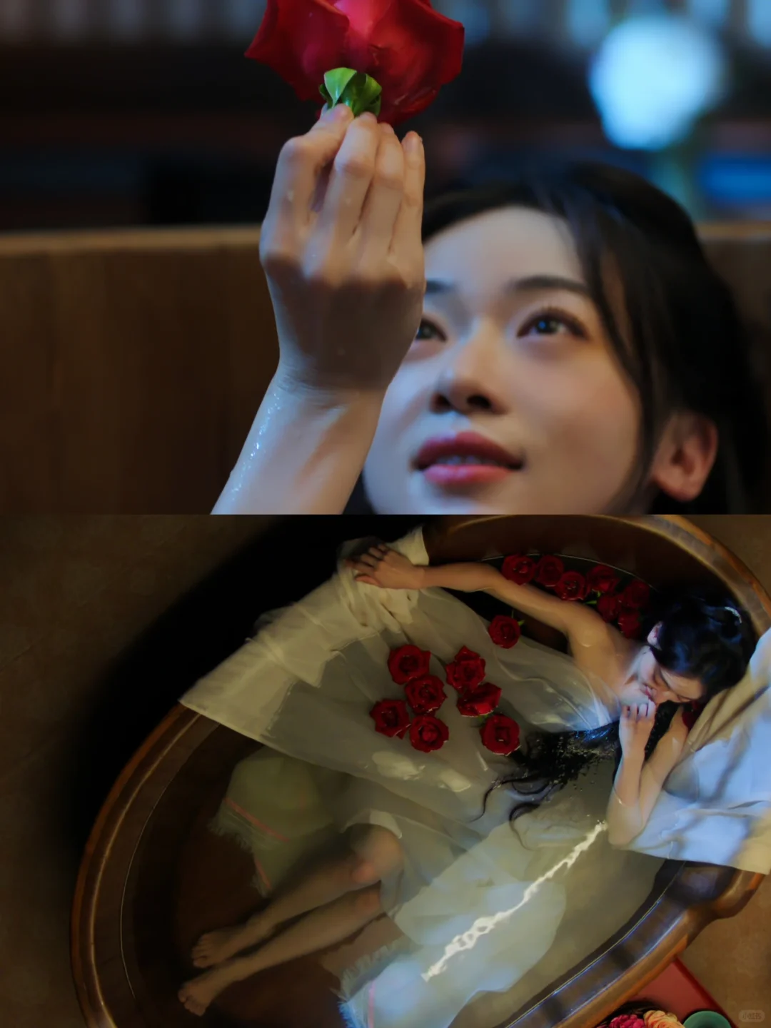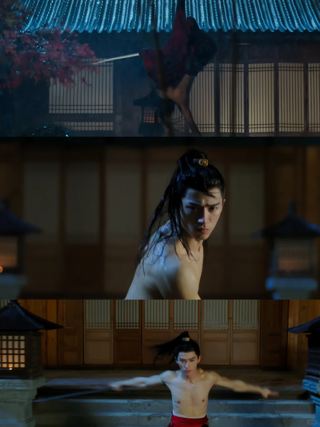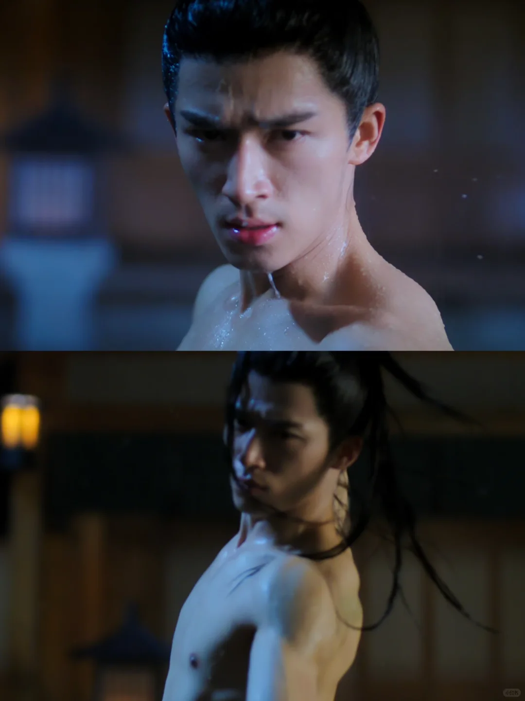 这俩,一个沐浴时对着玫瑰越看越甜越脸红心跳、一个雨中赤膊练剑闪转腾挪转圈圈,回忆思念情浓,无一字说其他、但满屏又甜又浓又清的“爱与荷尔蒙”气息~