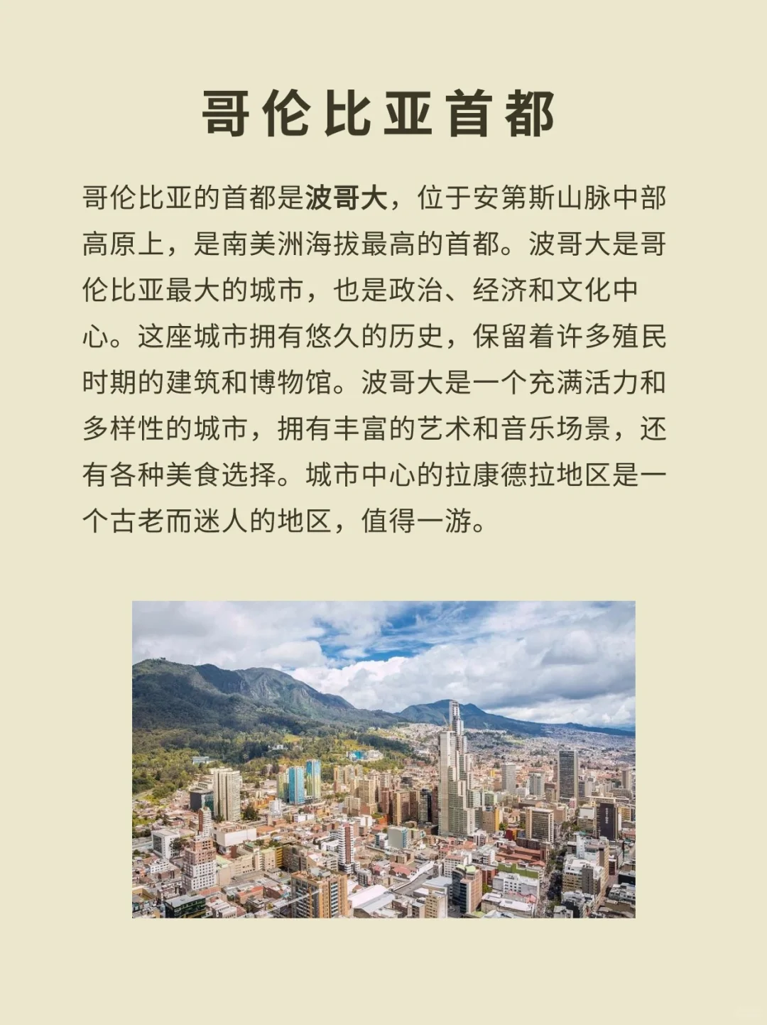 哥伦比亚的首都是波哥大(Bogotá),是该国最大的城市和政治、文化中心。