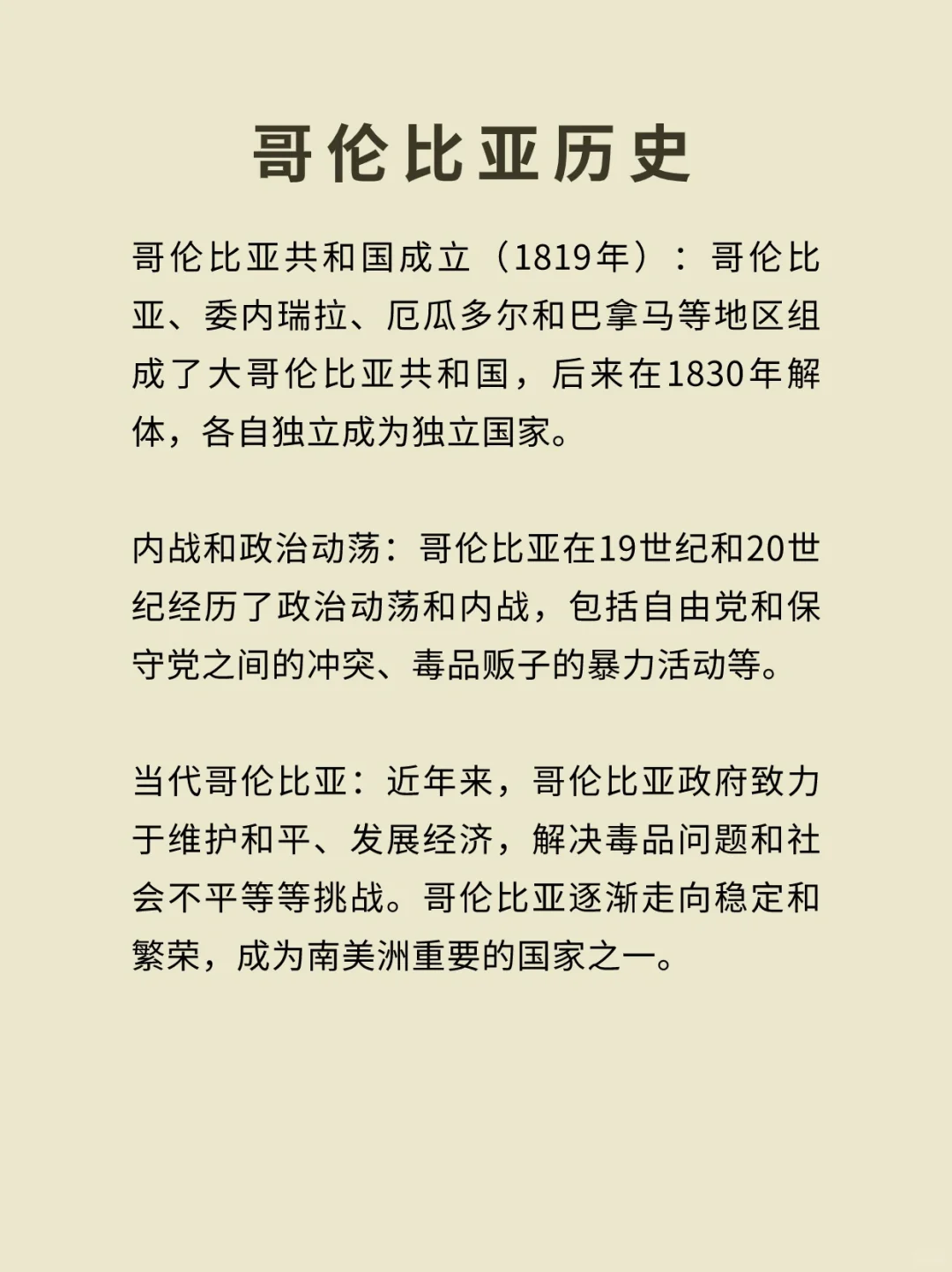 哥伦比亚曾经是西班牙殖民地,于1810年独立,成为独立国家。