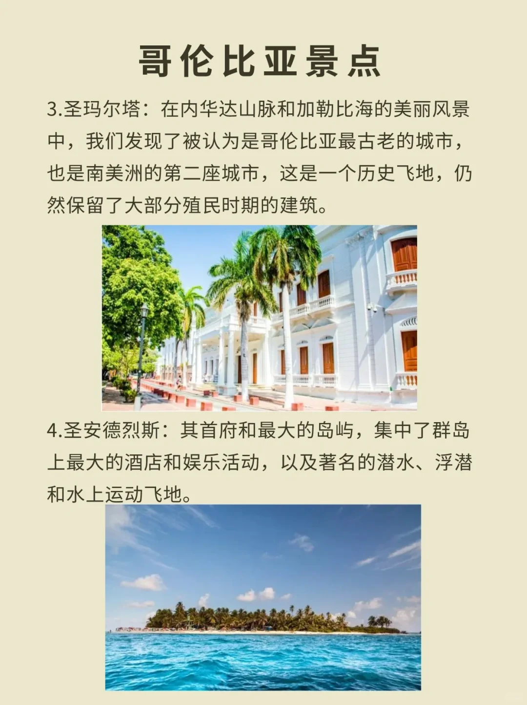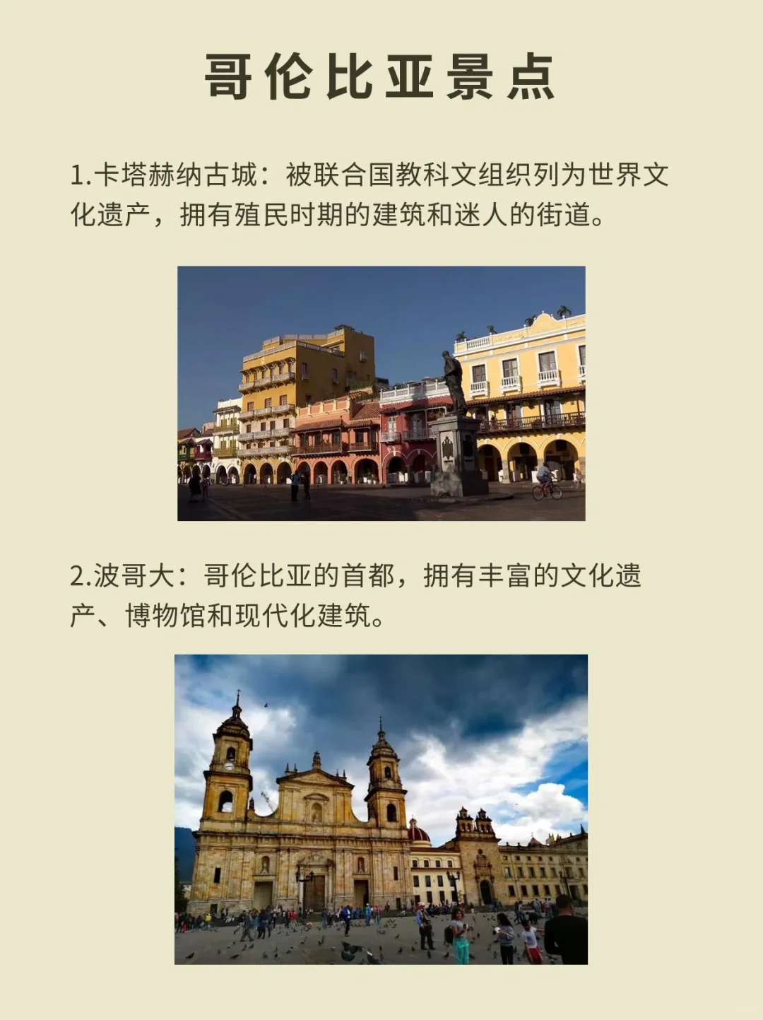 哥伦比亚拥有许多美丽的旅游景点,如卡塔赫纳古城、泰伦基利亚国家公园、圣阿古斯丁考古遗址等。