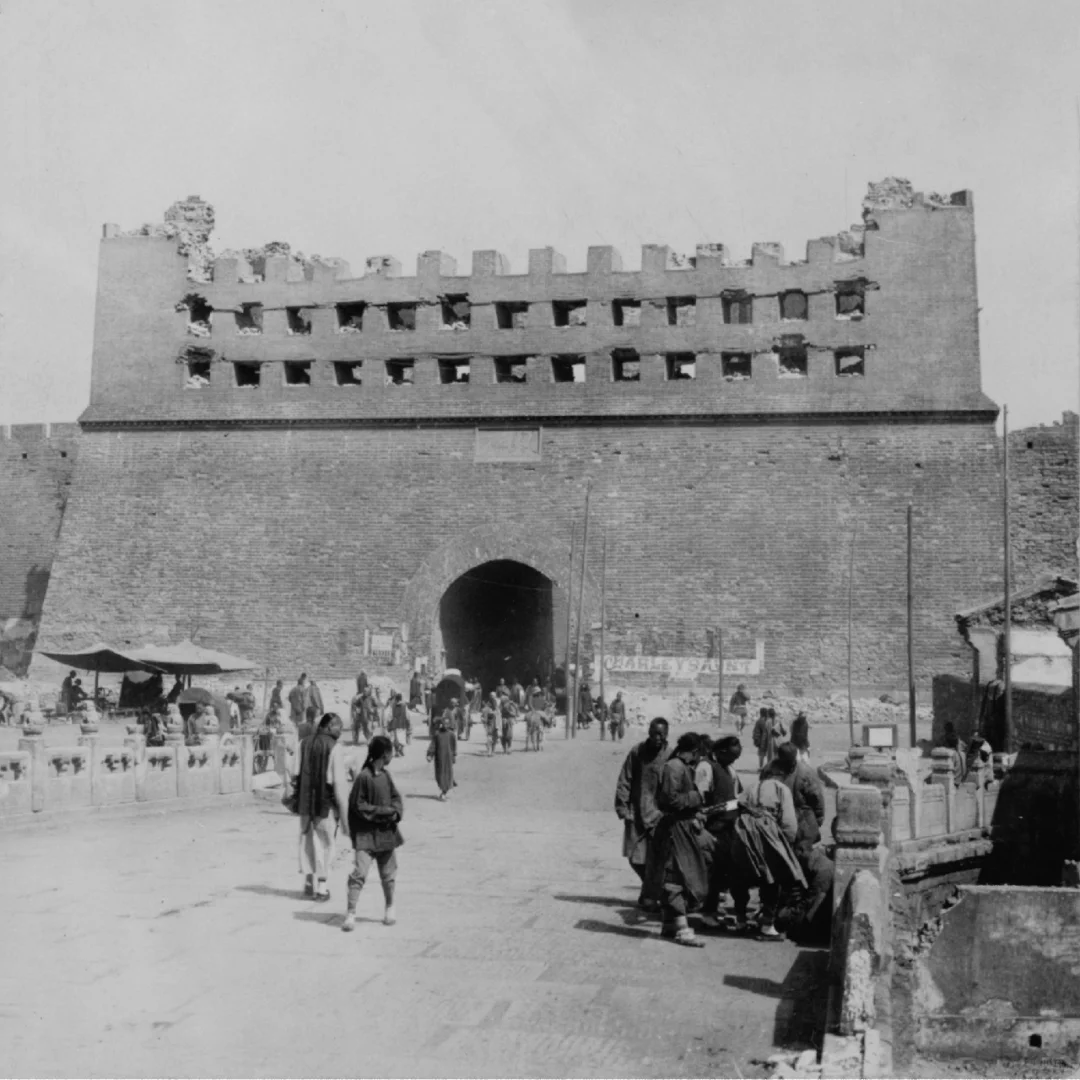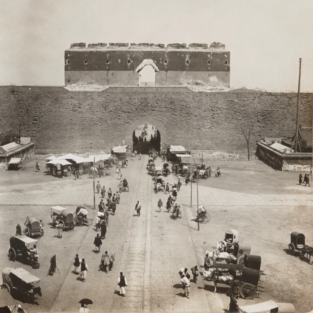 🍀图3、1901年老照片,前门翁城中,北面被战火摧毁的前门楼,西面侧观音庙,东侧关公庙;