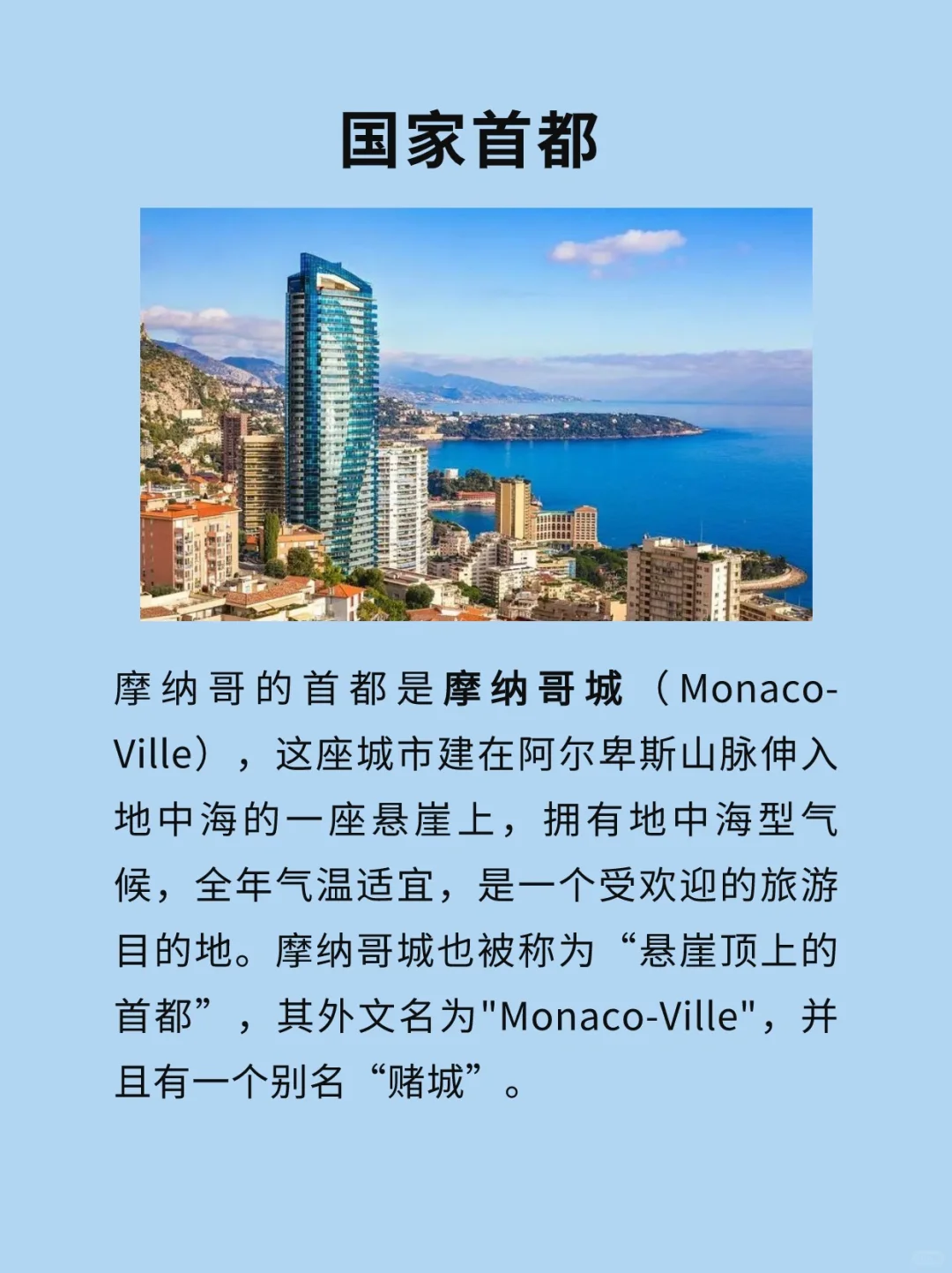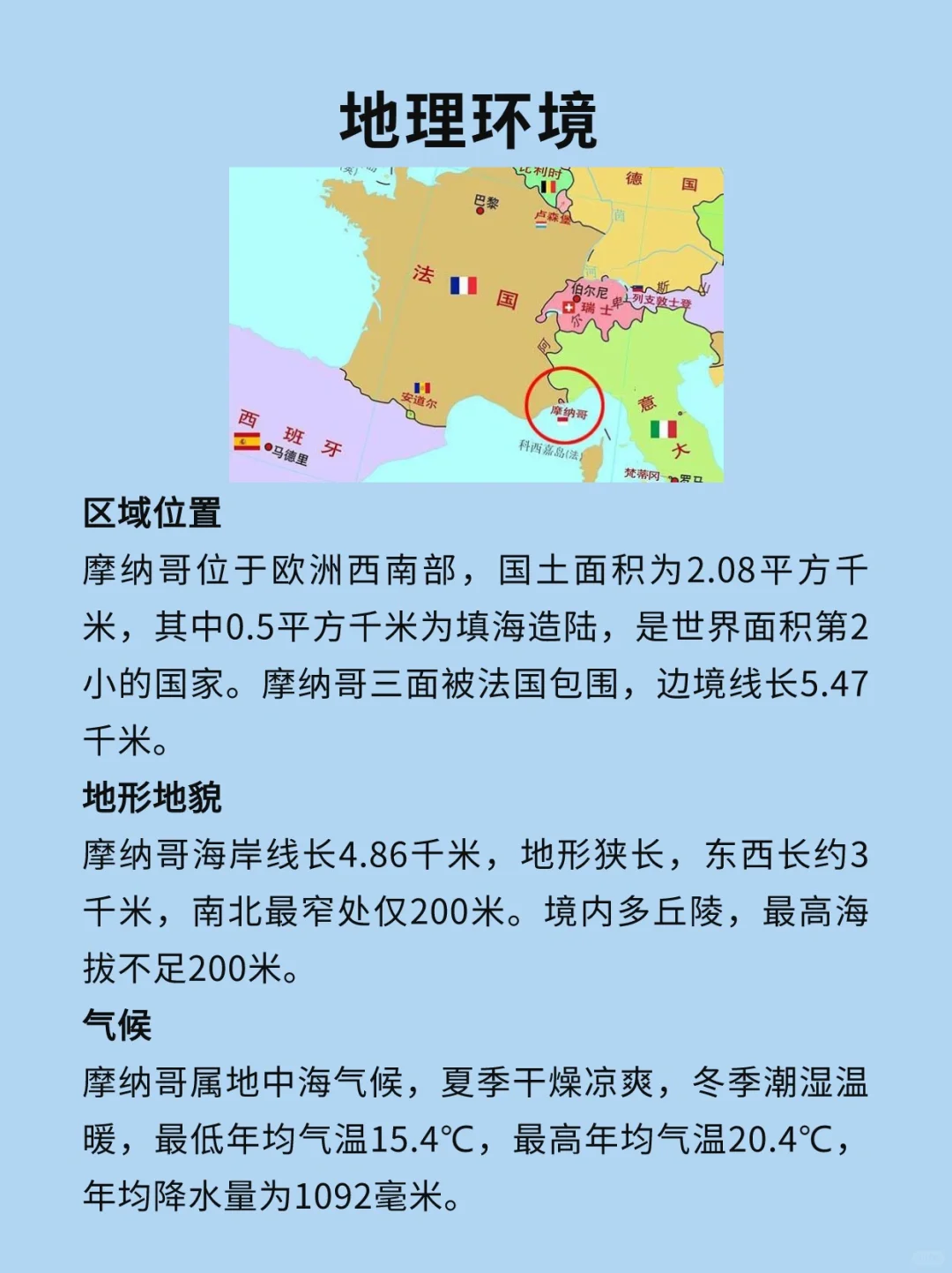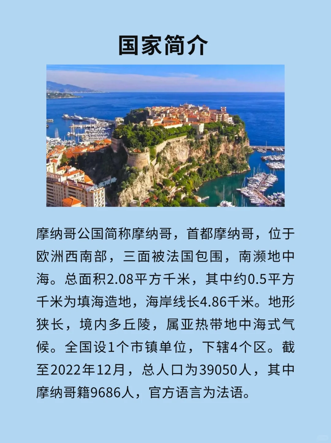 🇲🇨摩纳哥公国,简称摩纳哥,首都摩纳哥,位于欧洲西南部,三面被法国包围,南濒地中海。总面积2.08平方千米,其中约0.5平方千米为填海造地,海岸线长4.86千米。地形狭长,境内多丘陵,属亚热带地中海式气候。全国设1个市镇单位,下辖4个区。截至2022年12月,总人口为39050人,其中摩纳哥籍9686人,官方语言为法语。
