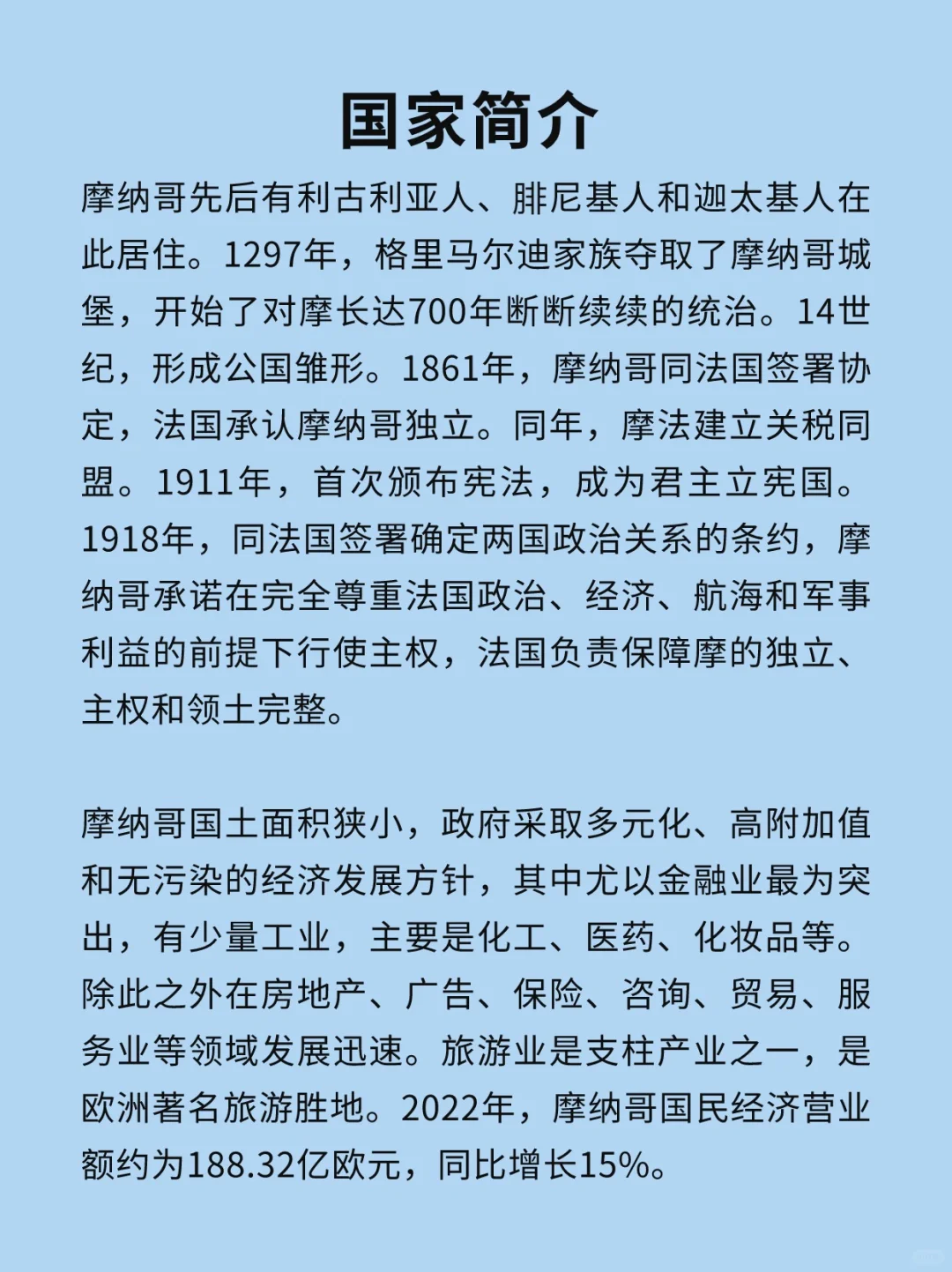 [氛围感R]除此之外在房地产、广告、保险、咨询、贸易、服务业等领域发展迅速。旅游业是支柱产业之一,是欧洲著名旅游胜地。2022年,摩纳哥国民经济营业额约为188.32亿欧元,同比增长15%。
