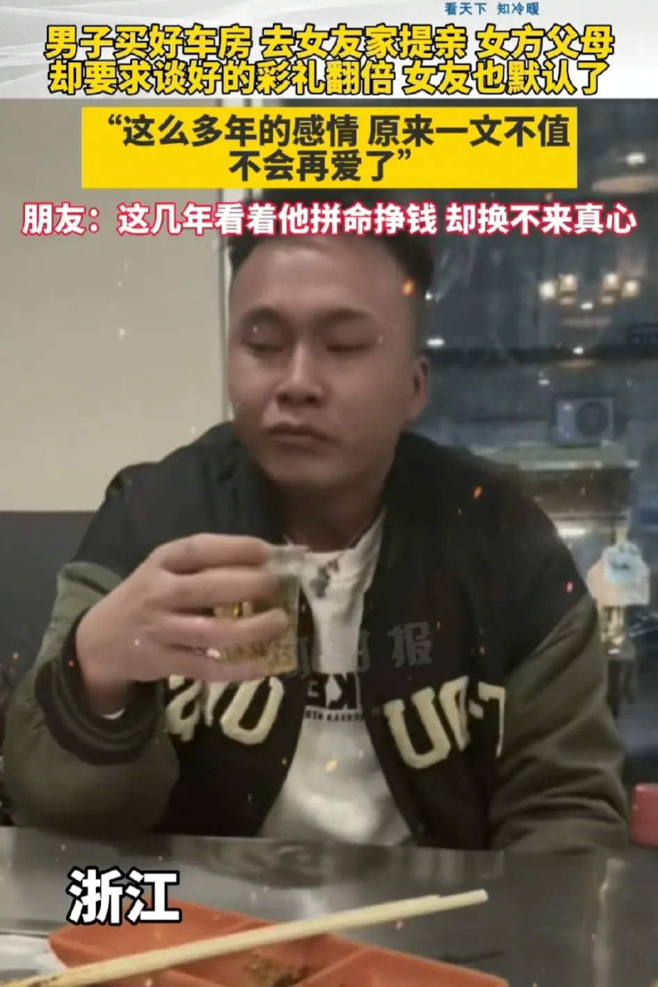 浙江一男子,买好了车子,也买好了房子,去女友家提亲。谁曾想,提亲当天,女友父母要求谈好的彩礼翻倍。