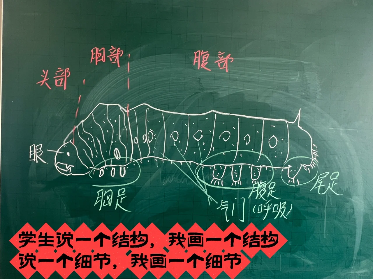 [打卡R]“你们说的细节越多,老师画得越逼真”,能鼓励学生更多地【描述细节】。(如蚕他们描述到了蚕胸部的褶皱和身体上的斑点[点赞R])