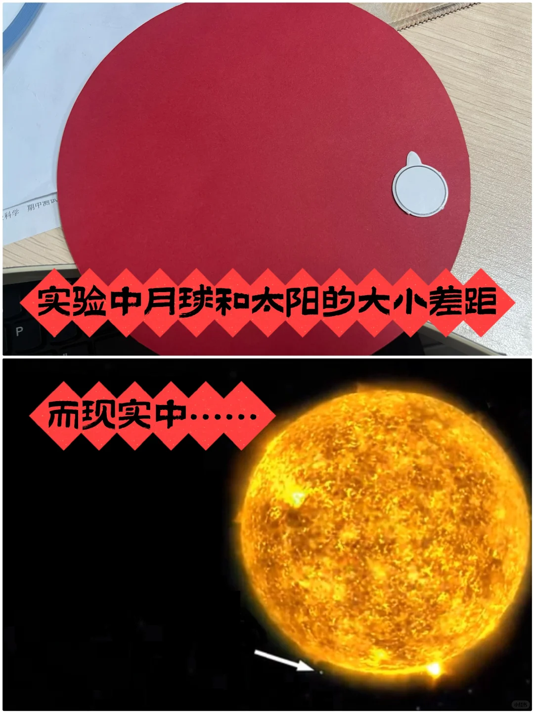 [私信R]:用这两个圆形做模拟实验,模拟太阳的同学都快退远到没位置退了,而现实中太阳比月球大得更多(图),因此现实中太阳距离地球也要远得更多!(玩梗:只远了“亿”点点)