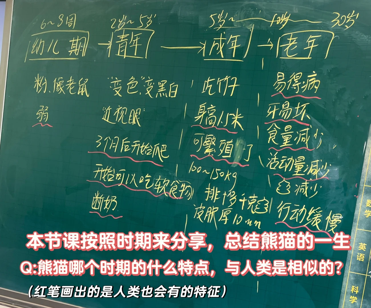 但是在梳理了熊猫的一生,以及类比了人的一生,学生很容易发展规律【老年和幼年时期是最脆弱的】,也是最需要照顾的。