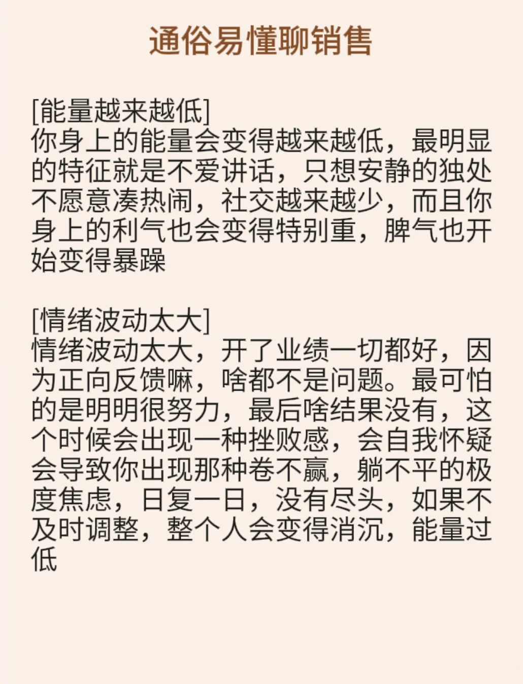 ⚠️能量越来越低 你身上的能量会变得越来越低,最明显的特征就是不爱讲话,只想安静的独处,不愿意凑热闹,社交越来越少,而且你身上的利气也会变得特别重,脾气也开始变得暴躁 — ⚠️情绪波动太大 情绪波动太大,开了业绩一切都好,因为正向反馈嘛,啥都不是问题。最可怕的是明明很努力,最后啥结果没有,这个时候会出现一种挫败感,会自我怀疑,会导致你出现那种卷不赢,躺不平的极度焦虑,日复一日,没有尽头,如果不及时调整,整个人会变得消沉,能量过低