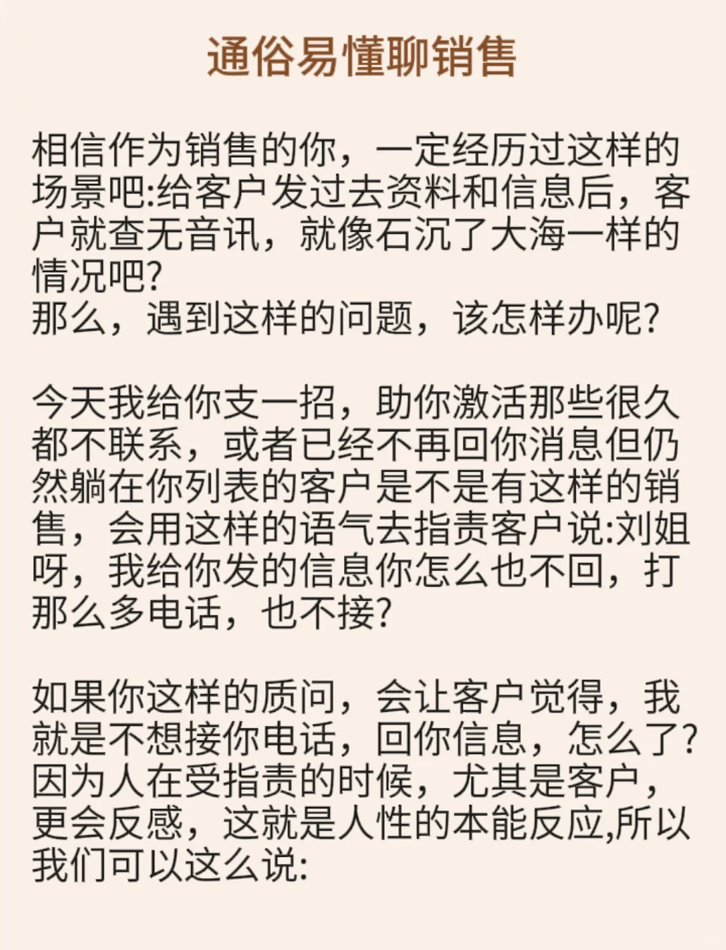 相信作为销售的你,一定经历过这样的场景吧:给客户发过去资料和信息后,客户就查无音讯,就像石沉了大海一样的情况吧? 💡那么,遇到这样的问题,该怎样办呢? - 💯今天我给你支一招,助你激活那些很久都不联系,或者已经不再回你消息但仍然躺在你列表的客户