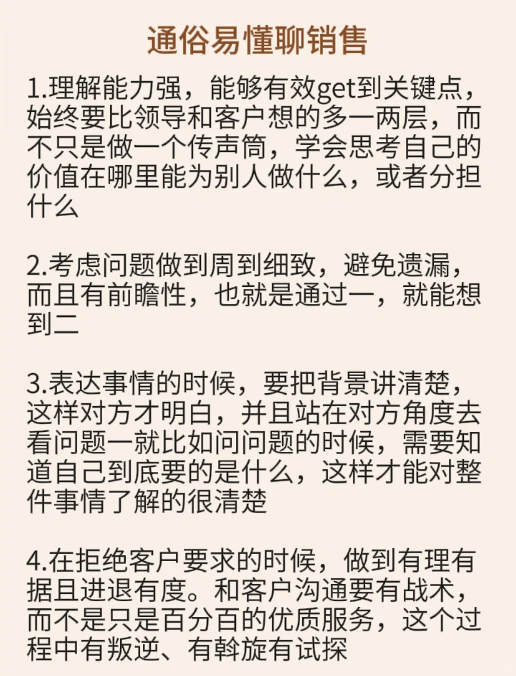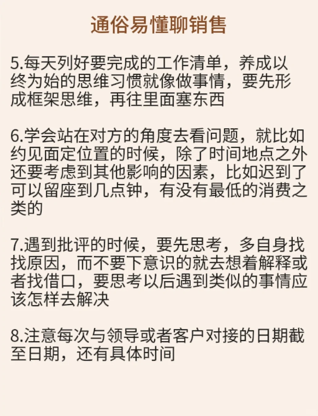 💟1.理解能力强,能够有效get到关键点 💟2.考虑问题做到周到细致 💟3.表达事情的时候清晰有条理 💟4.在拒绝客户要求的时候,做到有理有据且进退有度 💟5.每天列好要完成的工作清单 💟6.学会站在对方的角度去看问题 💟7.遇到批评的时候,要先思考,多自身找找原因 💟8.注意每次与领导或者客户对接的日期 💟9.工作可以形成闭环 💟10.要把客户当作自己的人