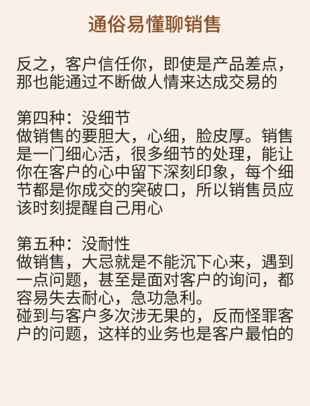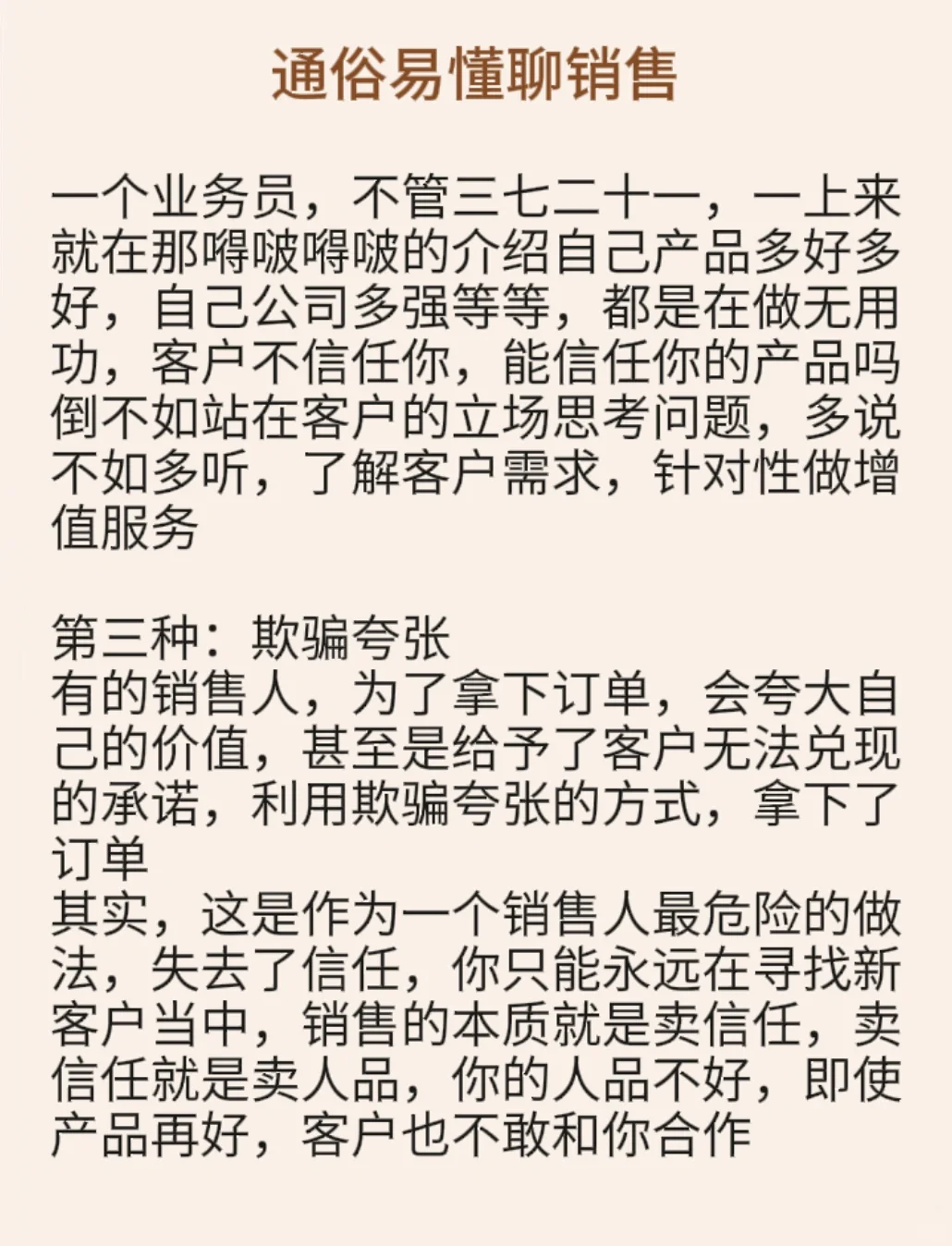 其实,这是作为一个销售人最危险的做法,失去了信任,你只能永远在寻找新客户当中,销售的本质就是卖信任,卖信任就是卖人品,你的人品不好,即使产品再好,客户也不敢和你合作反之,客户信任你,即使是产品差点,那也能通过不断做人情来达成交易的