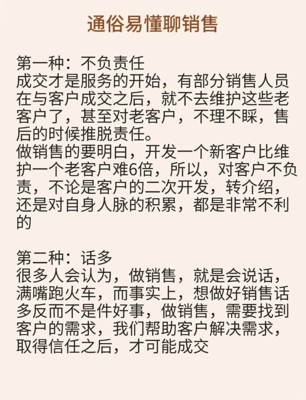 做销售的要明白,开发一个新客户比维护一个老客户难6倍,所以,对客户不负责,不论是客户的二次开发,转介绍,还是对自身人脉的积累,都是非常不利的