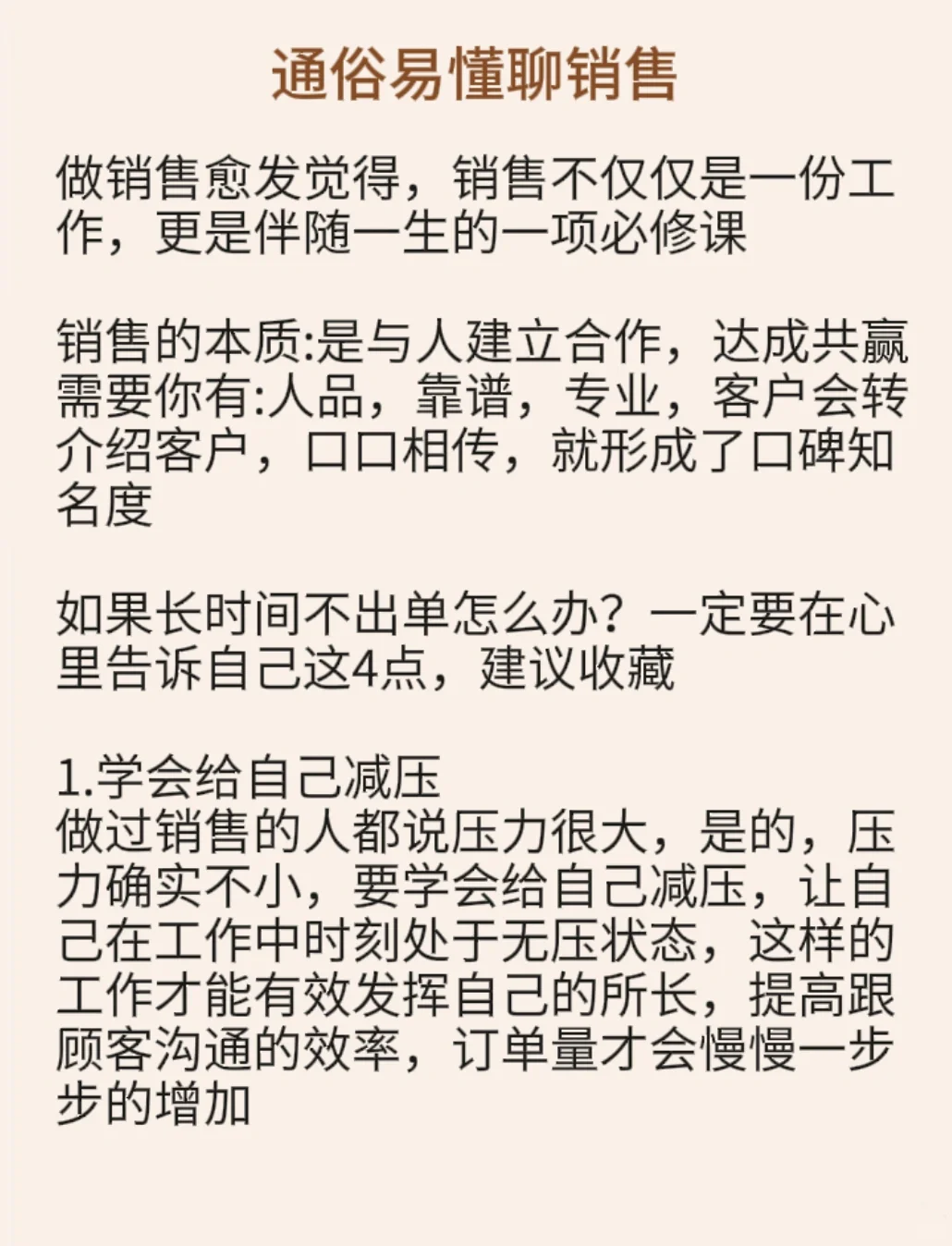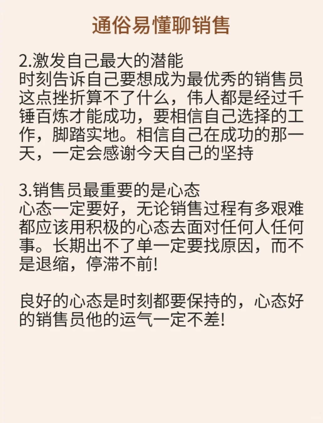 心态一定要好,无论销售过程有多艰难,都应该用积极的心态去面对任何人任何事。长期出不了单一定要找原因,而不是退缩,停滞不前!