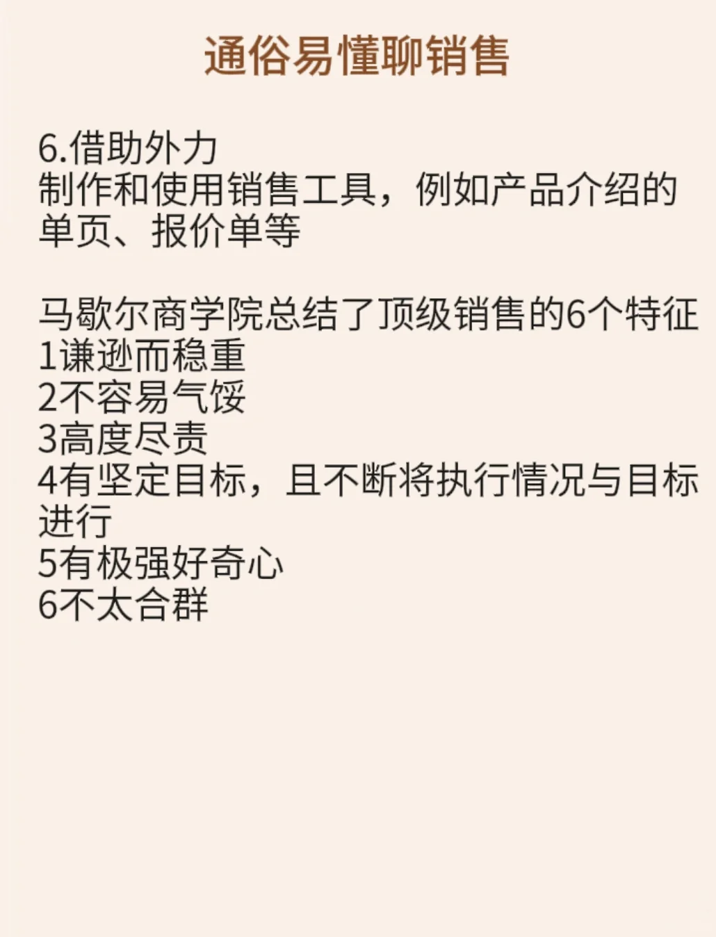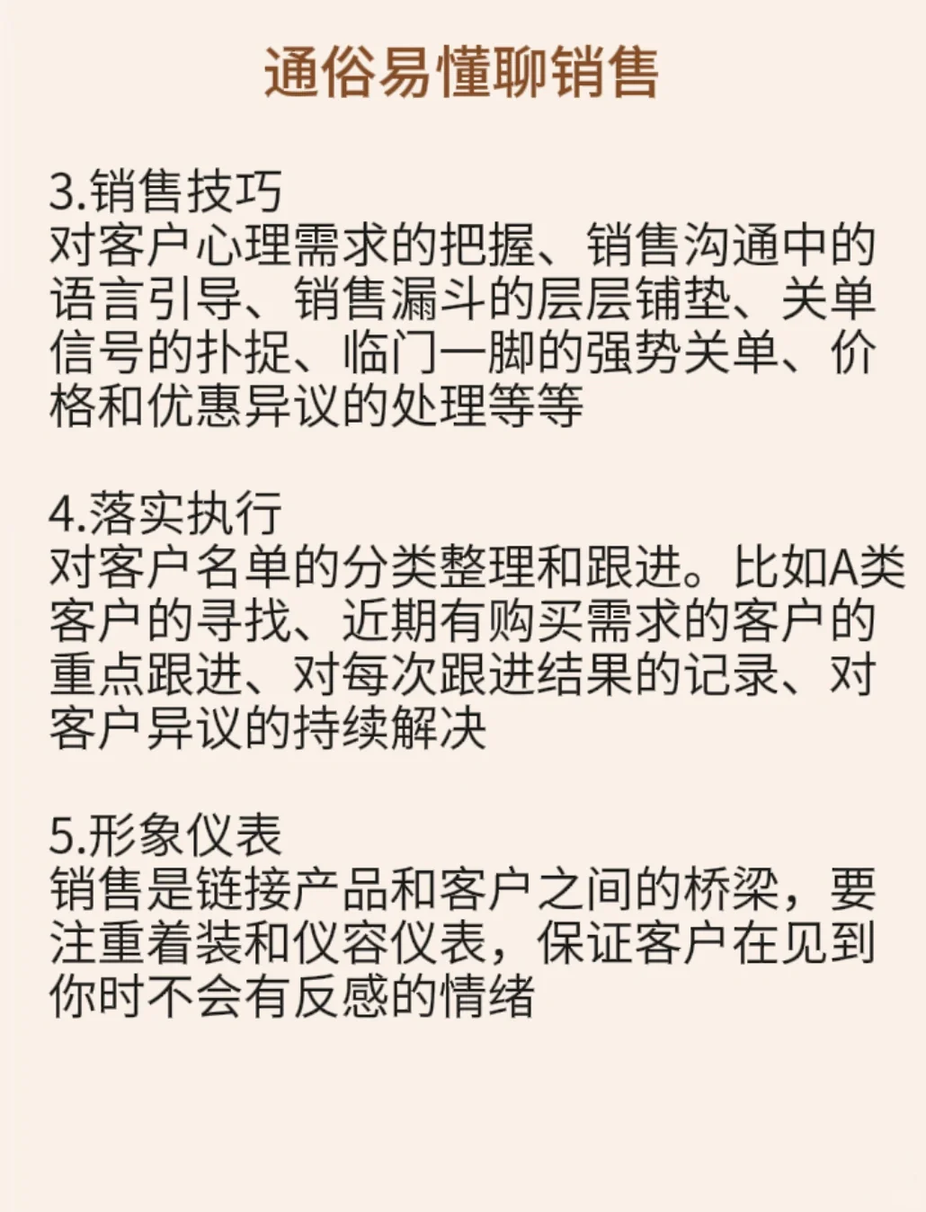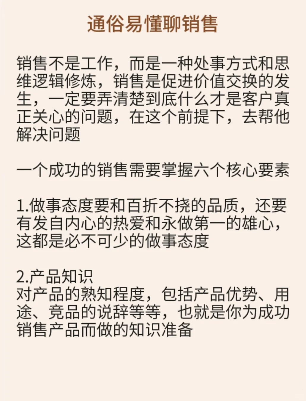💎销售不是工作,而是一种处事方式和思维逻辑修炼,销售是促进价值交换的发生,一定要弄清楚到底什么才是客户真正关心的问题,在这个前提下,去帮他解决问题 ‼️一个成功的销售需要掌握六个核心要素‼️ 1.做事态度 2.产品知识 3.销售技巧 4.落实执行 5.形象仪表 6.借助外力
