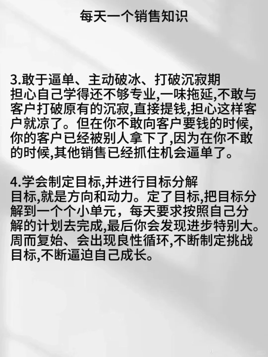 3.敢于逼单、主动破冰、打破沉寂期担心自己学得还不够专业,一味拖延,不敢与客户打破原有的沉寂,直接提钱,担心这样客户就凉了。但在你不敢向客户要钱的时候,你的客户已经被别人拿下了,因为在你不敢的时候,其他销售已经抓住机会逼单了。