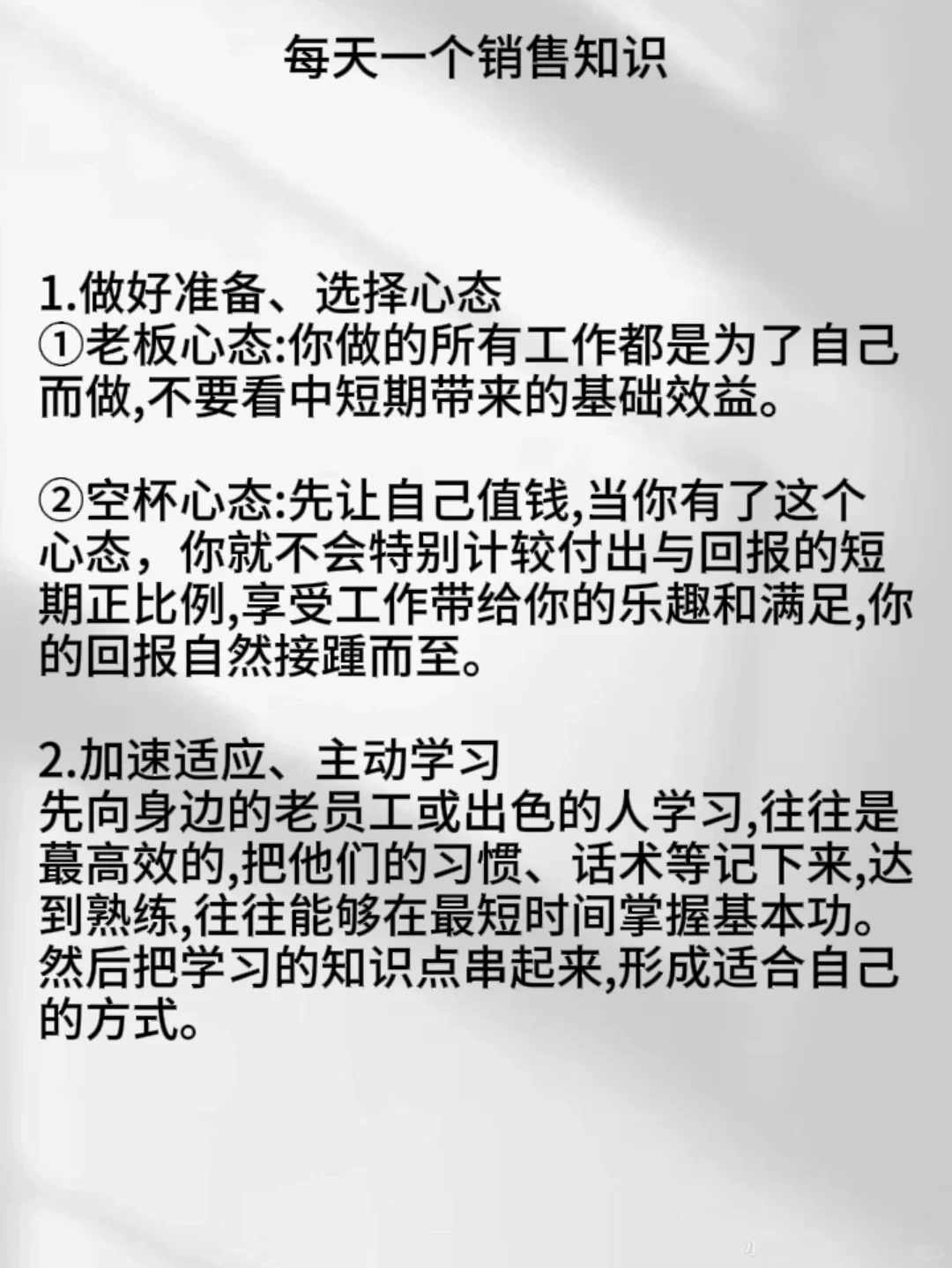 先向身边的老员工或出色的人学习,往往是蕞高效的,把他们的习惯、话术等记下来,达到熟练,往往能够在最短时间掌握基本功。然后把学习的知识点串起来,形成适合自己的方式。