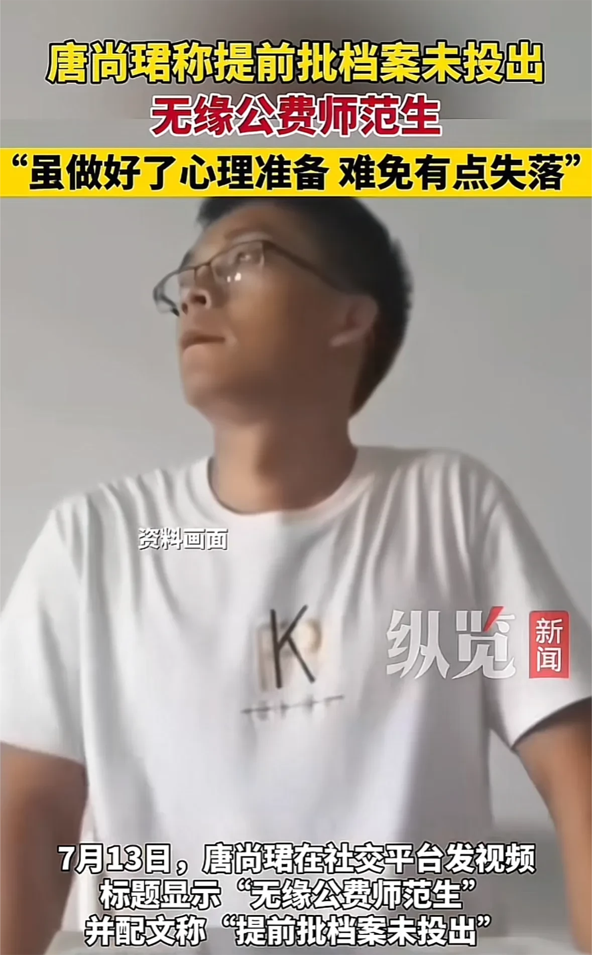 唐尚珺称提前批档案未投出,无缘公费师范生没录取,难免失落。 7月13日,唐尚珺发视频说,提前批公费师范生没被录取,当时只填了两个学校最好的心理学,公费师范生的愿望破灭了,只能等下一批次,佩服唐尚珺的一往无前的精神,高考考了16年,年年不去上大学,无法自拔。 去年没服从调剂,今年的理由是无缘公费师范生。为第十七次高考找好了理由。