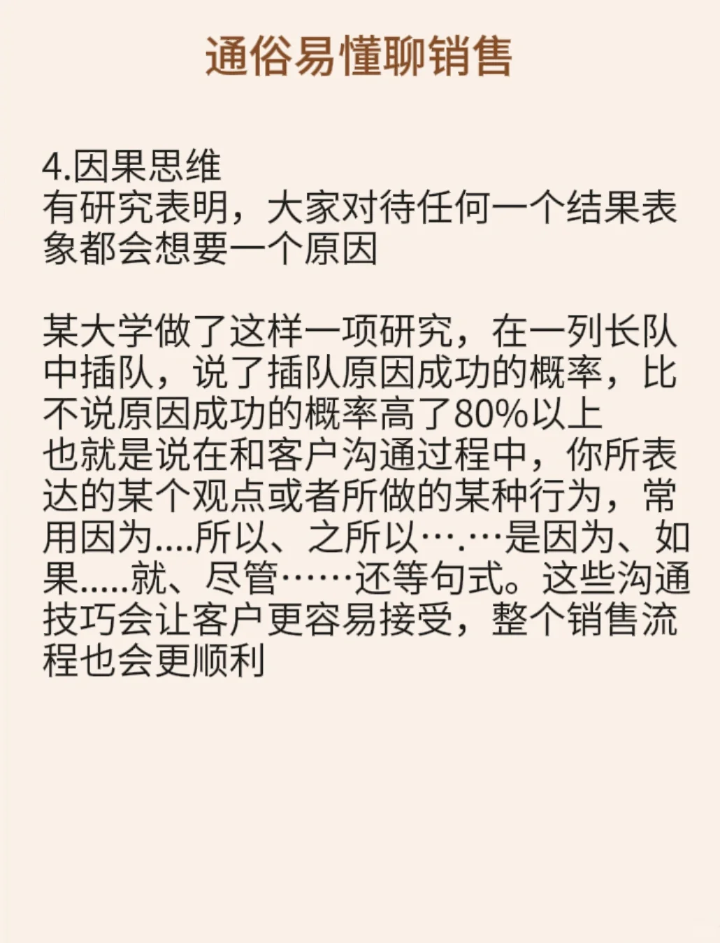 也就是说在和客户沟通过程中,你所表达的某个观点或者所做的某种行为,常用因为....所以、之所以….…是因为、如果.....就、尽管……还等句式。这些沟通技巧会让客户更容易接受,整个销售流程也会更顺利