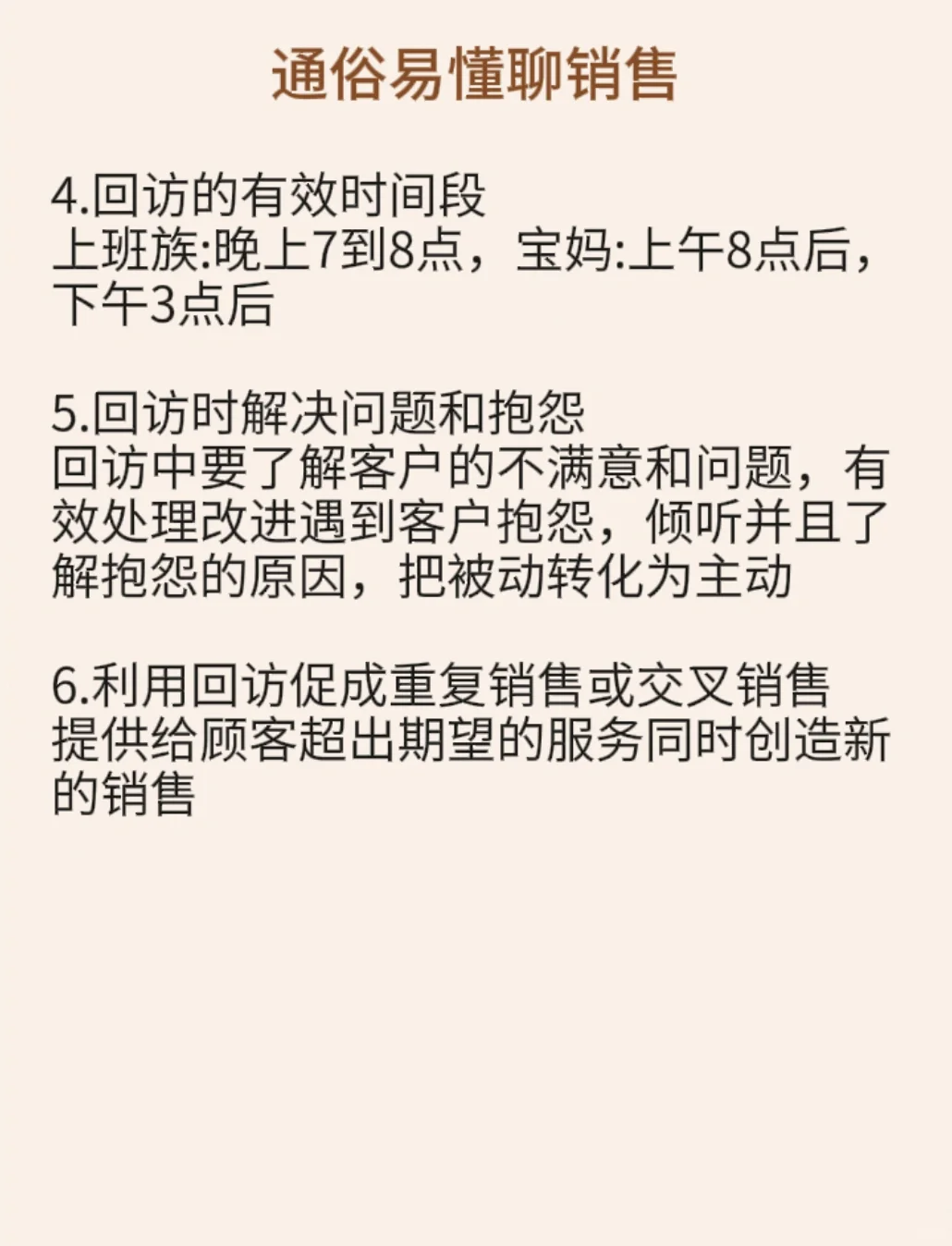 回访中要了解客户的不满意和问题,有效处理改进遇到客户抱怨,倾听并且了解抱怨的原因,把被动转化为主动