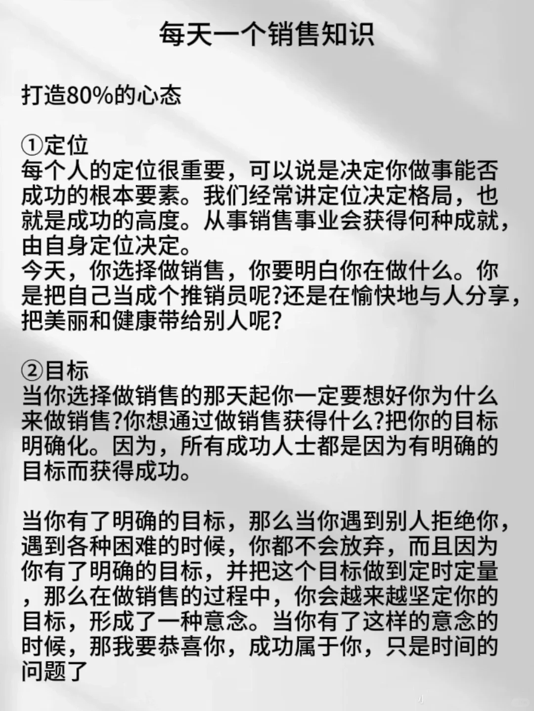 当你有了明确的目标,那么当你遇到别人拒绝你,遇到各种困难的时候,你都不会放弃,而且因为你有了明确的目标,并把这个目标做到定时定量,那么在做销售的过程中,你会越来越坚定你的目标,形成了一种意念。当你有了这样的意念的时候,那我要恭喜你,成功属于你,只是时间的问题了