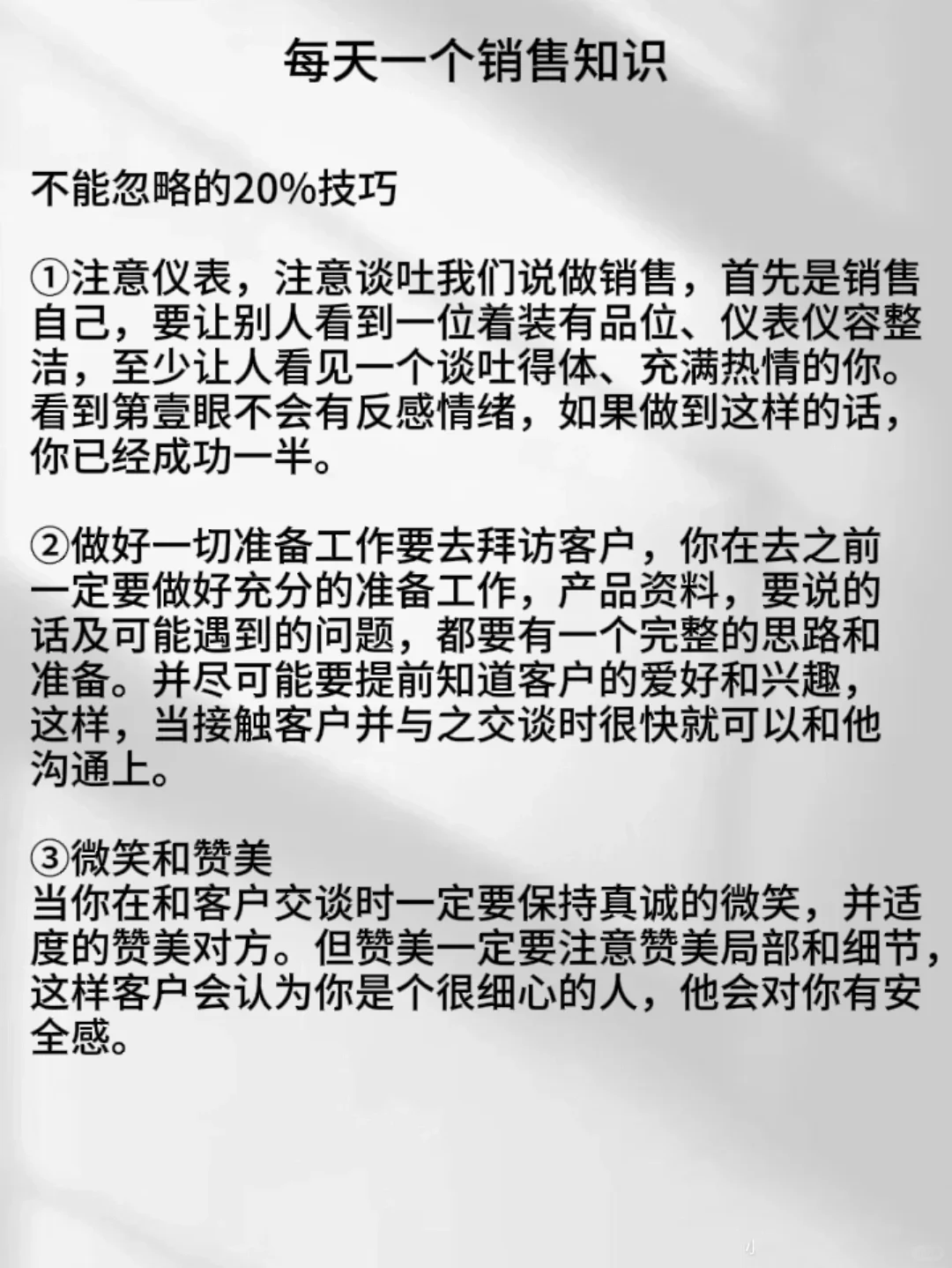 ⚠️①注意仪表,注意谈吐我们说做销售,首先是销售自己,要让别人看到一位着装有品位、仪表仪容整洁,至少让人看见一个谈吐得体、充满热情的你。看到第壹眼不会有反感情绪,如果做到这样的话,你已经成功一半。
