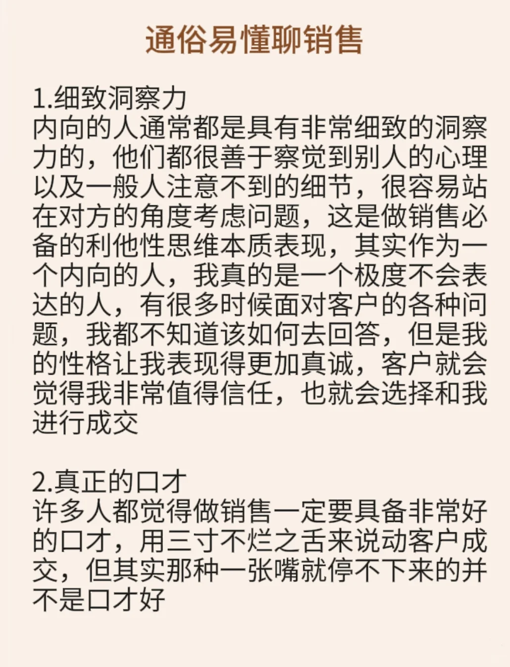 内向的人通常都是具有非常细致的洞察力的,他们都很善于察觉到别人的心理以及一般人注意不到的细节,很容易站在对方的角度考虑问题,这是做销售必备的利他性思维本质表现,其实作为一个内向的人,我真的是一个极度不会表达的人,有很多时候面对客户的各种问题,我都不知道该如何去回答,但是我的性格让我表现得更加真诚,客户就会觉得我非常值得信任,也就会选择和我进行成交