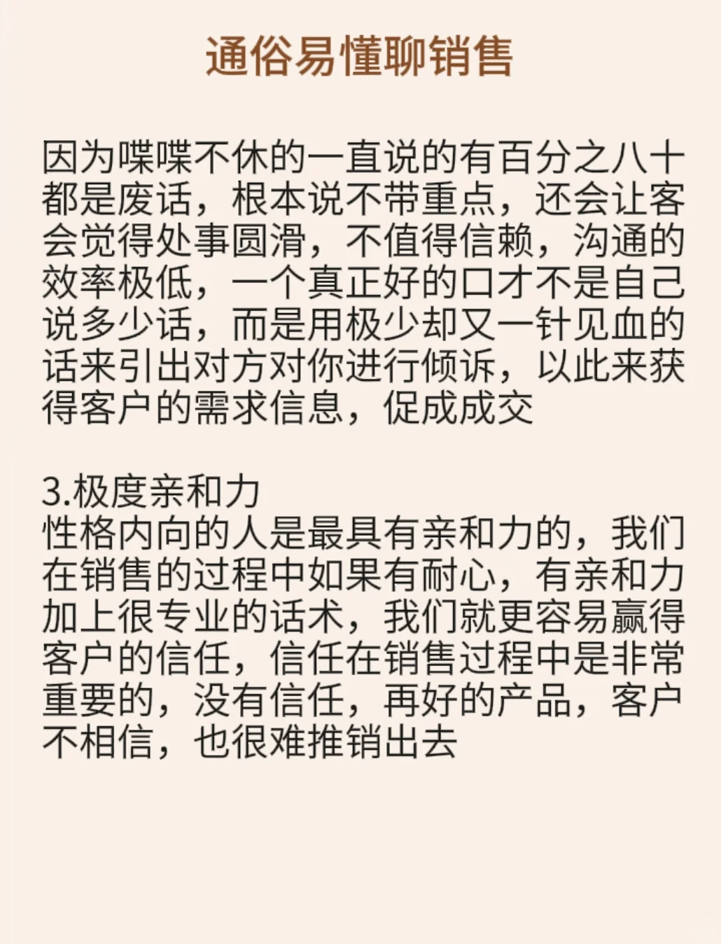 性格内向的人是最具有亲和力的,我们在销售的过程中如果有耐心,有亲和力加上很专业的话术,我们就更容易赢得客户的信任,信任在销售过程中是非常重要的,没有信任,再好的产品,客户不相信,也很难推销出去