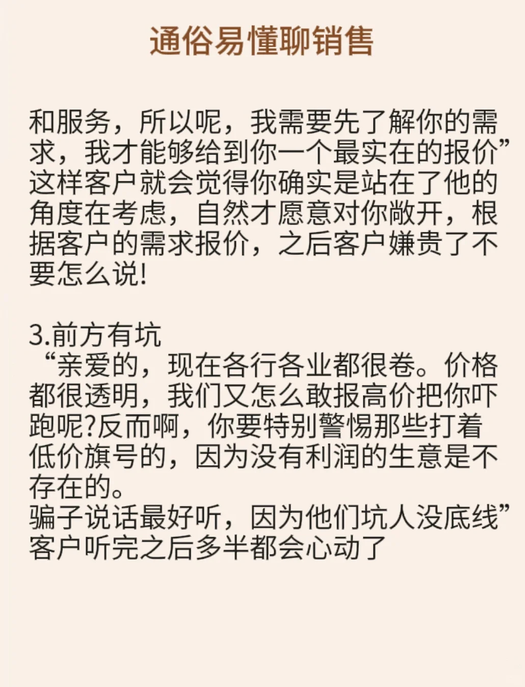 这样客户就会觉得你确实是站在了他的角度在考虑,自然才愿意对你敞开,根据客户的需求报价,之后客户嫌贵了不要怎么说!