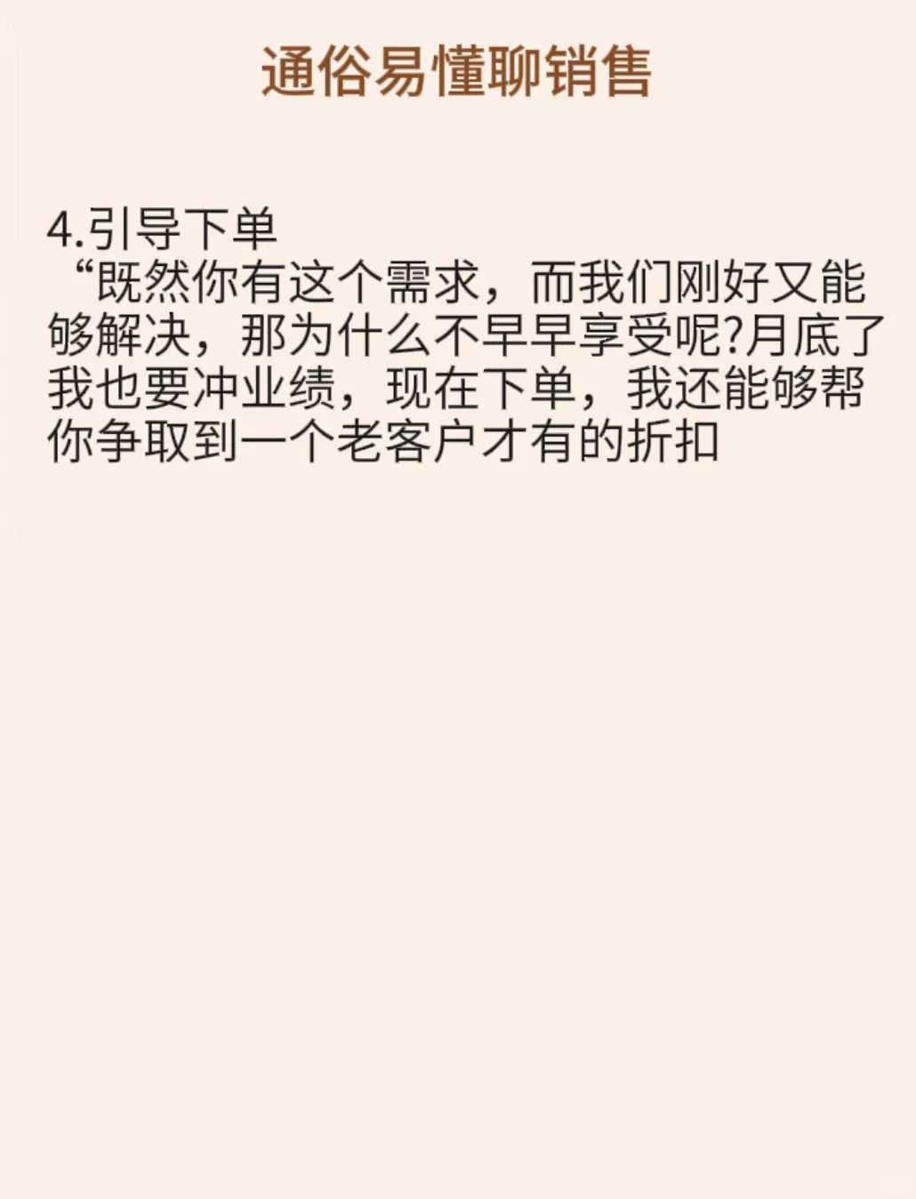 “既然你有这个需求,而我们刚好又能够解决,那为什么不早早享受呢?月底了我也要冲业绩,现在下单,我还能够帮你争取到一个老客户才有的折扣