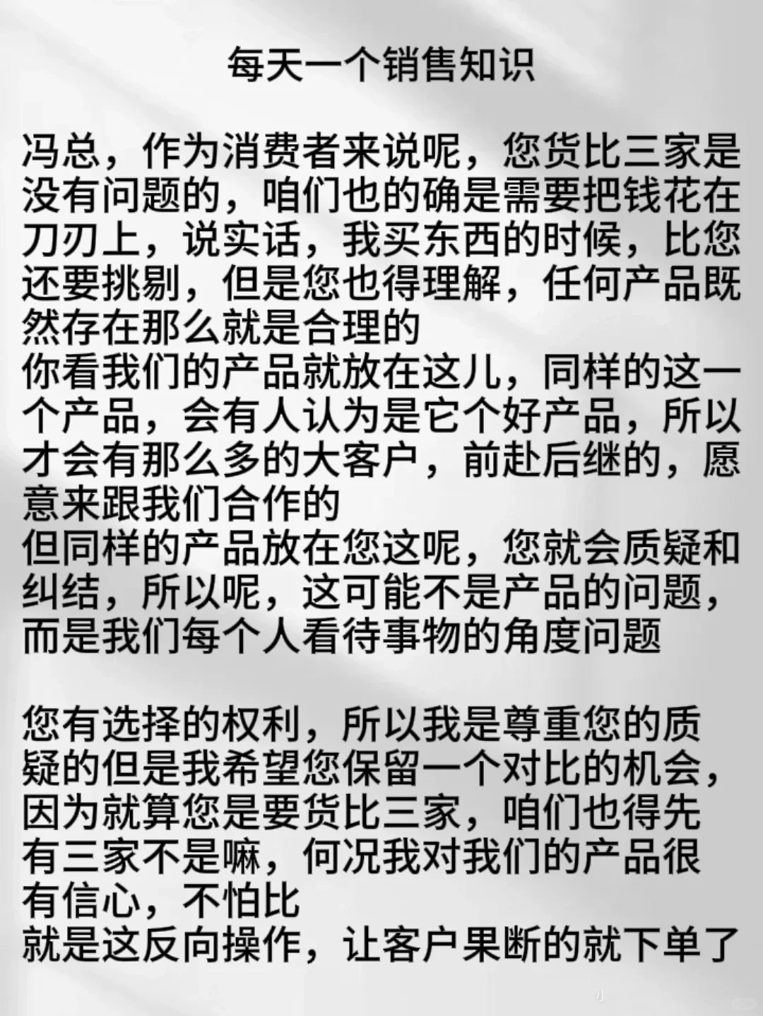 💎冯总,作为消费者来说呢,您货比三家是没有问题的,咱们也的确是需要把钱花在刀刃上,说实话,我买东西的时候,比您还要挑剔,但是您也得理解,任何产品既然存在那么就是合理的